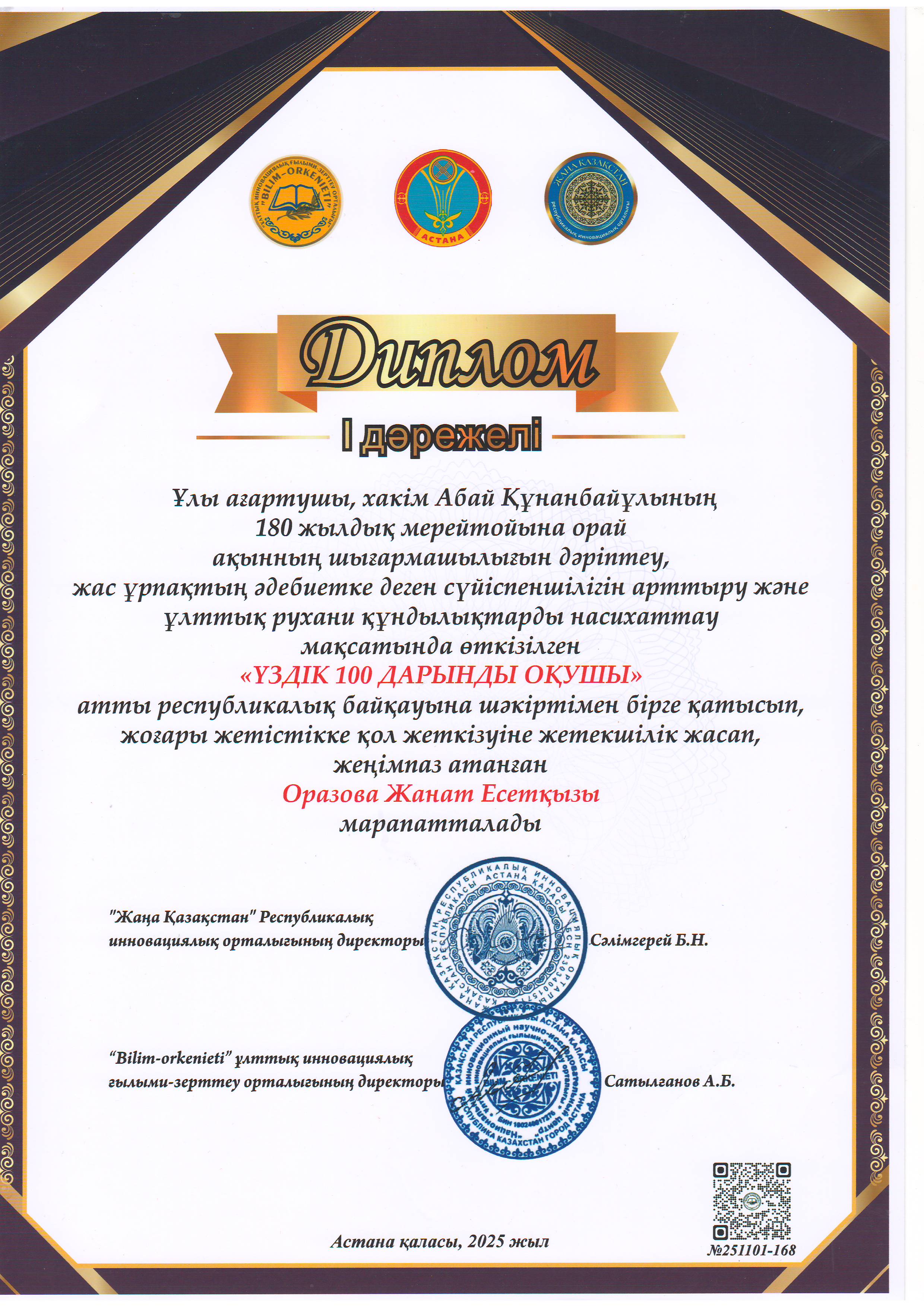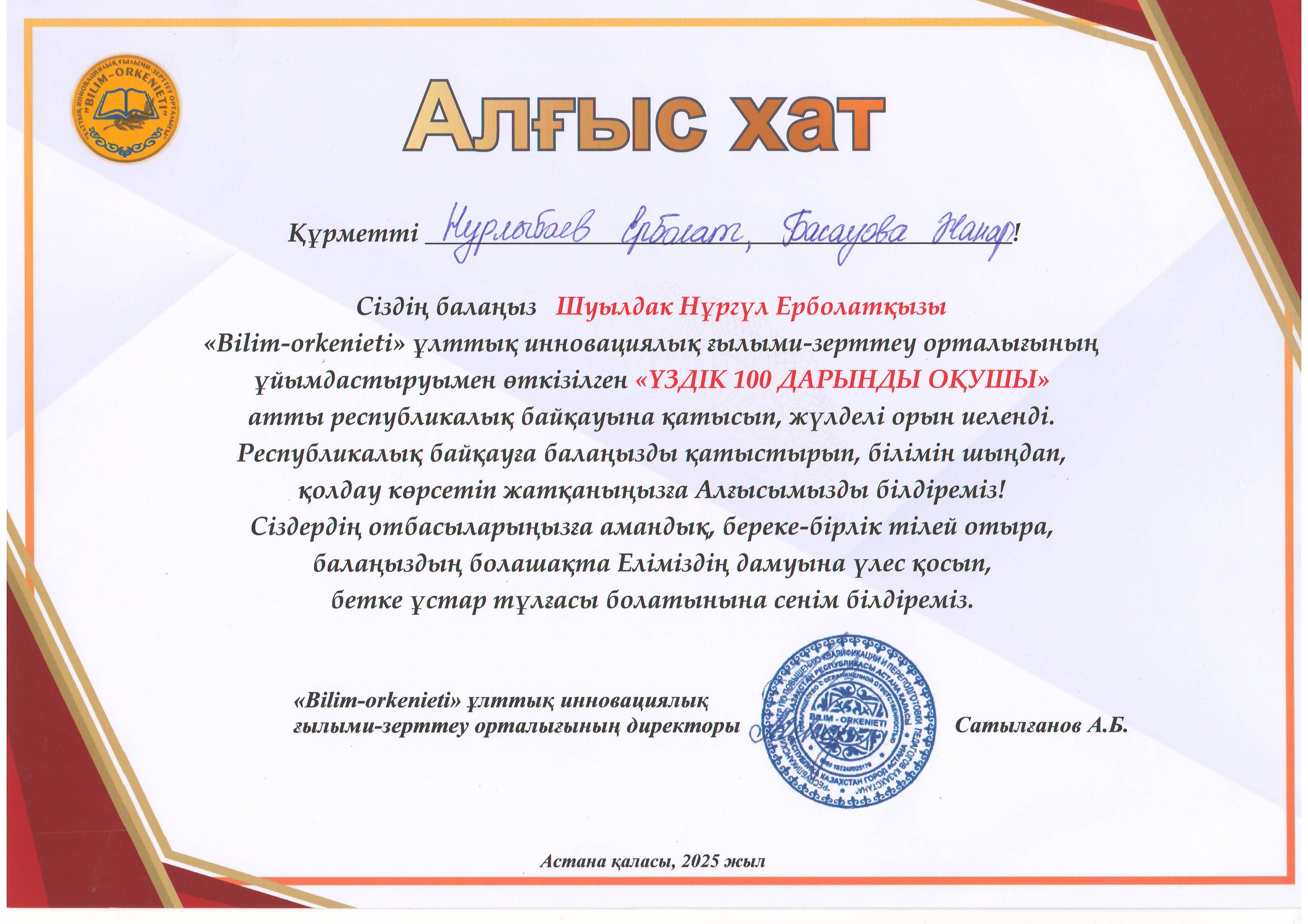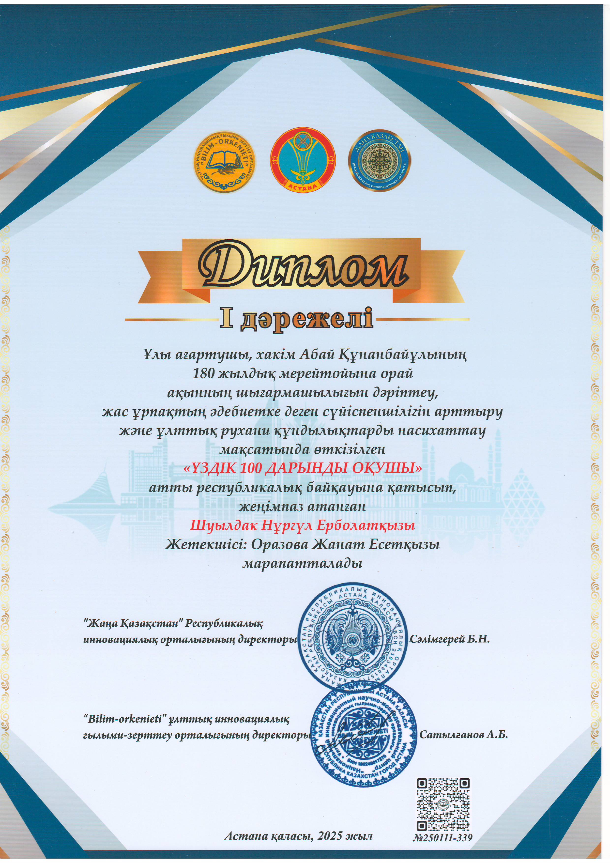 "Мектептен тыс білім беру орталығы" МКҚК, "Асыл сөз" үйірмесінің оқушысы Шуылдак Нұргүл дана ойшыл, ағартушы Абай Құнанбайұлының шығармашылығын дəріптеу, ұлттық құндылықтарды ұрпақ санасына сіңіру мақсатында өткізілген республикалық шығармашылық «Абай оқулары» байқауына белсене қатысып, ерекше дарыны мен өнерін көрсетіп, жұмысы үздік деп танылуына орай, Астана қаласында салтанатты марапаттау рәсіміне, «ҮЗДІК 100 ДАРЫНДЫ ОҚУШЫ» атты дарынды оқушылар форумына жолдама алып, "ҚАЗАҚСТАН ДАРЫНЫ" атты төсбелгішесі, төсбелгішені куәландыратын КУӘЛІК, «ҚАЗАҚСТАН ДАРЫНЫ» атты СТАТУЭТКАСЫ, Республикалық І дәрежелі ДИПЛОМ, Ата - анасына қолдау көрсеткені үшін АЛҒЫС ХАТ, сонымен қатар, Қазақстан Республикасының Президент орталығына экскурсия жасады. Жетекшісі Оразова Жанат Есетқызы Республикалық І дәрежелі дипломмен марапатталды.