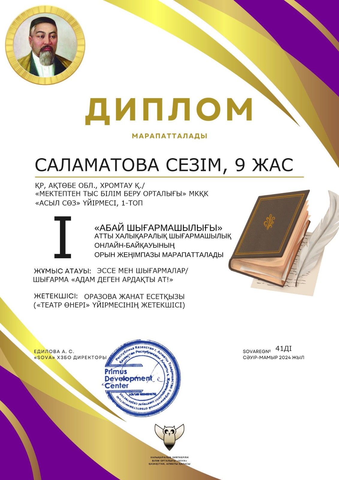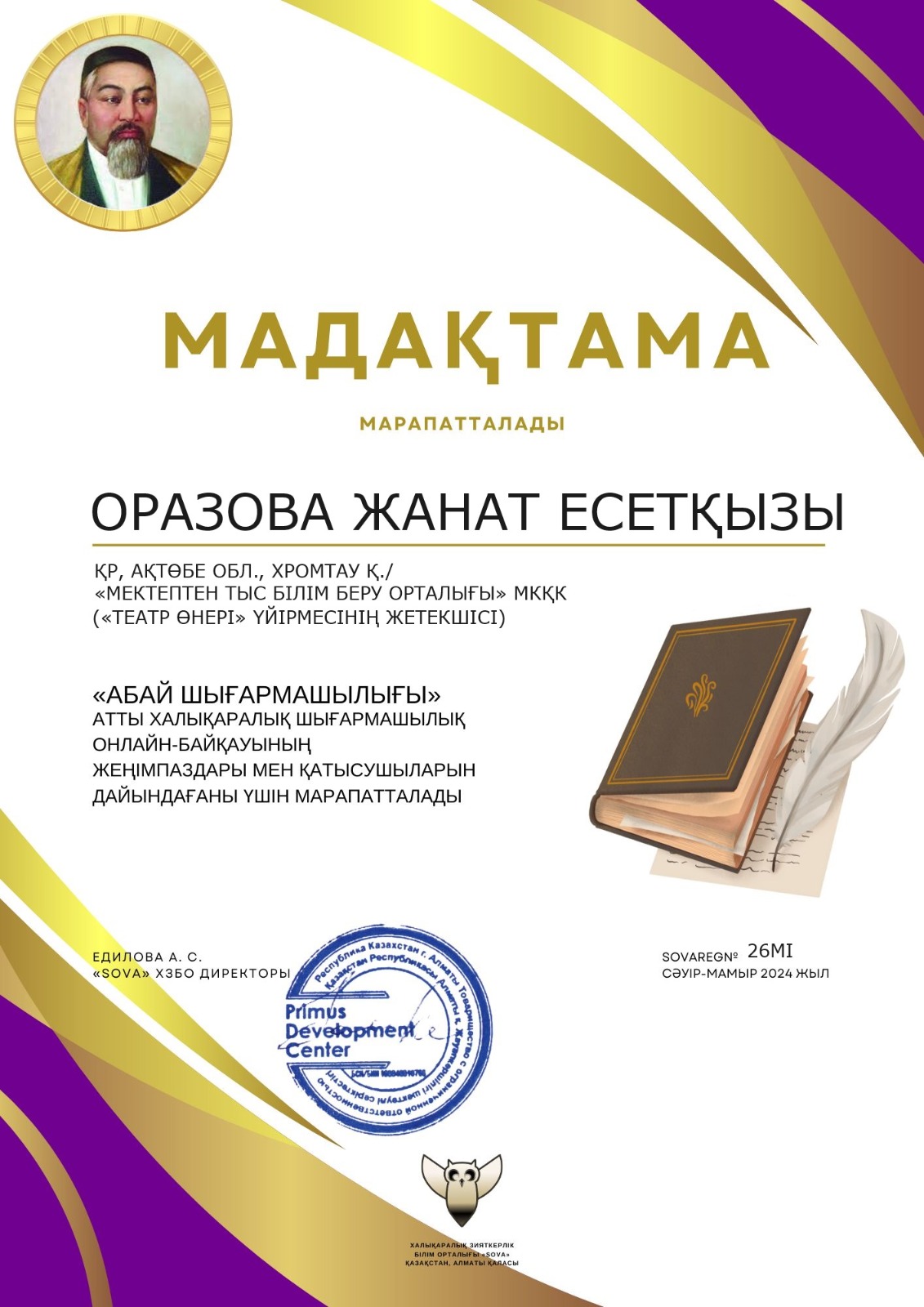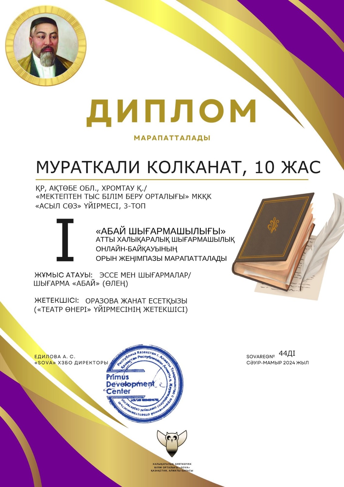 «Мектептен тыс білім беру орталығы» МКҚК-ның «Театр өнері» үйірмесінің оқушылары «Абай шығармашылығы» атты халықаралық шығармашылық онлайн-байқауына белсене қатысып, жүлделі орындар иеленіп, дипломмен марапатталды.