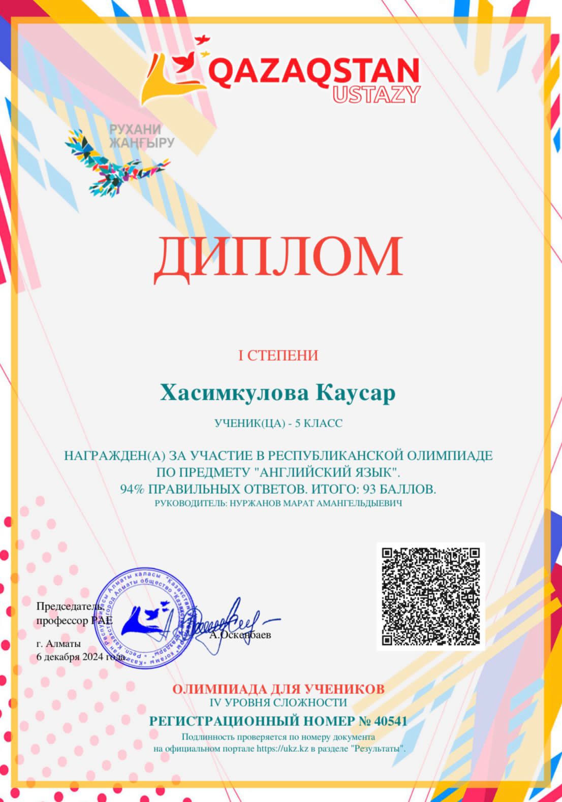 Хасимкулова Каусар -1 орын