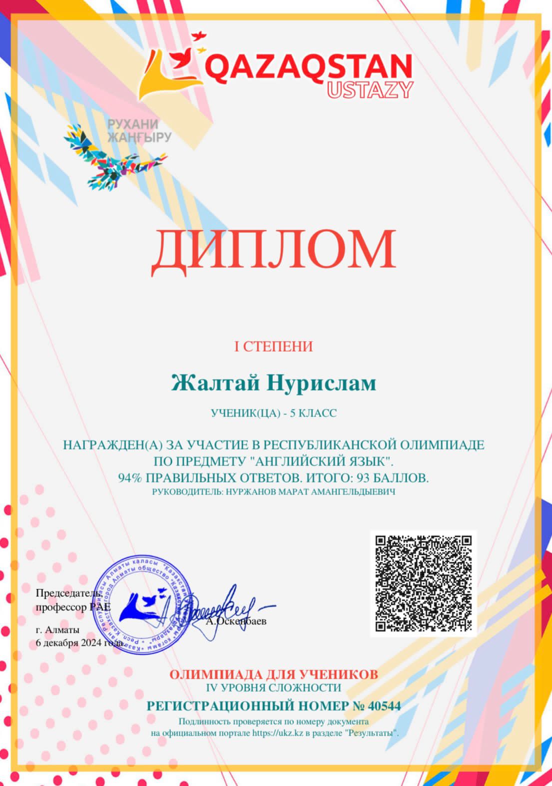 Жолтай Нурислам -1 орын
