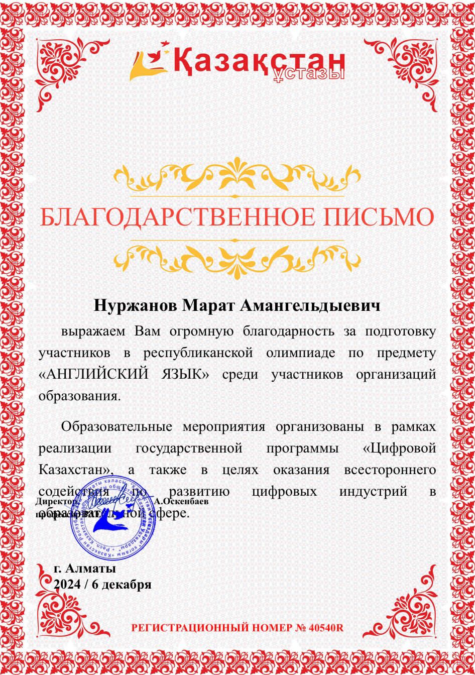 Жетекшісі Нуржанов М.А. алғыс хатпен марапатталды.