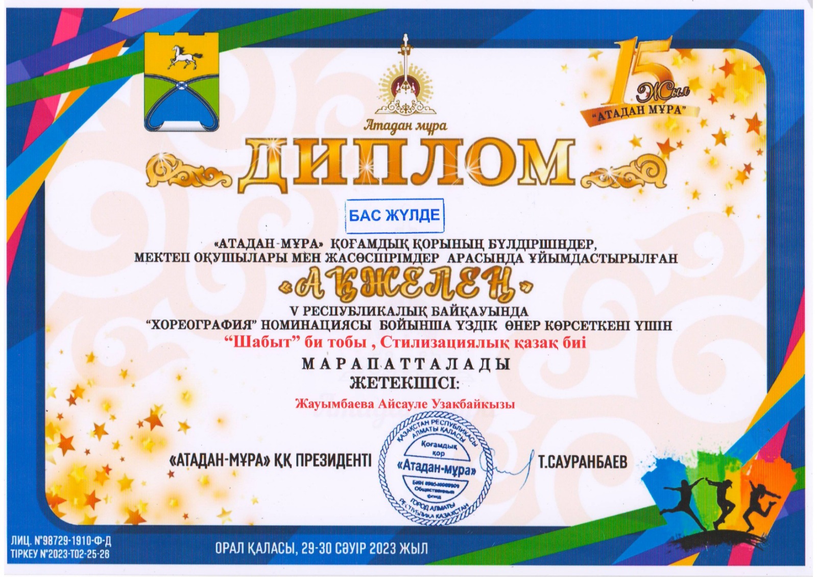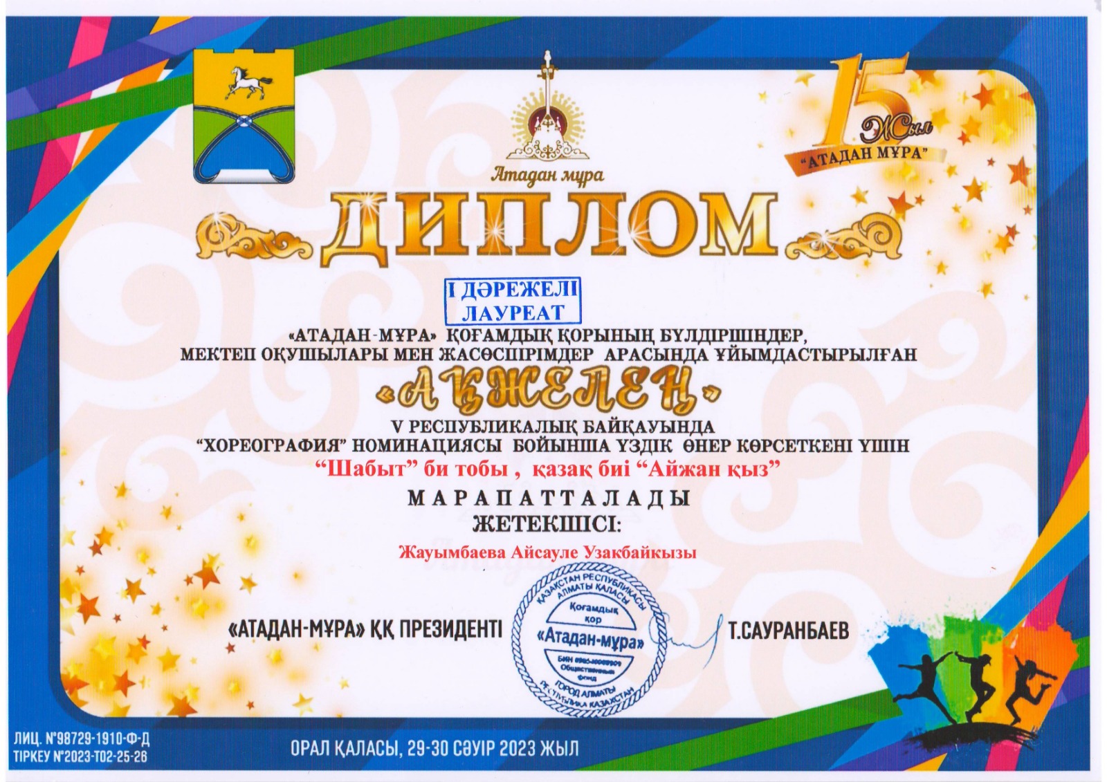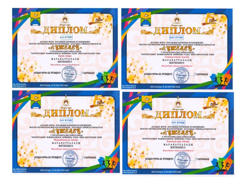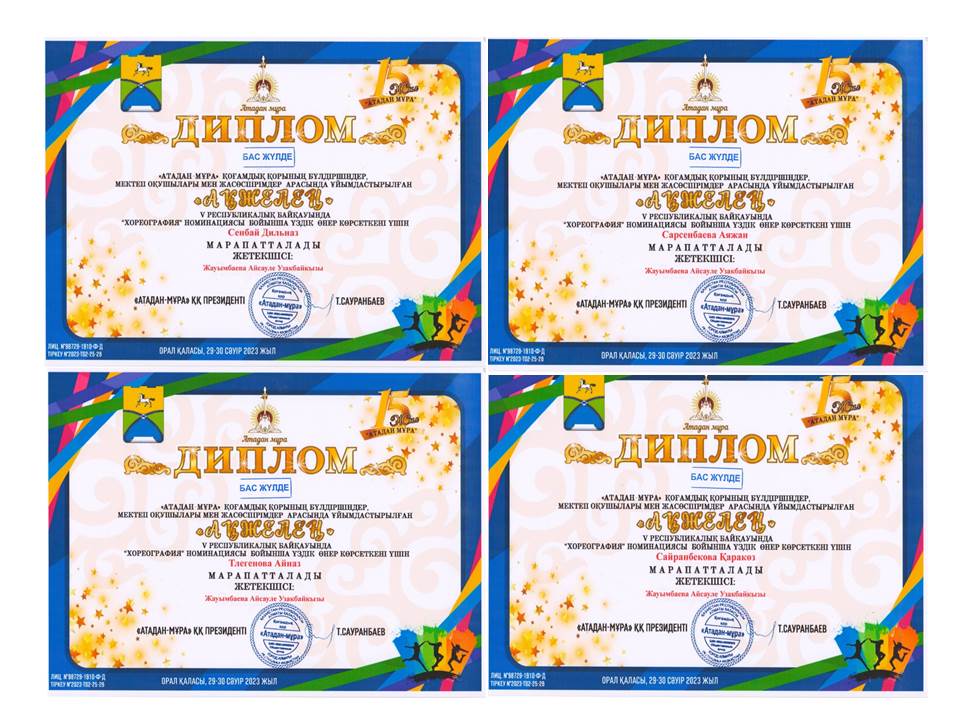 2023 жылы 30 сәуірде "Атадан мұра" қоғамдық қорының ұйымдастыруымен Орал қаласында өткен "Ақжелең" V республикалық байқауының "хореография" номинациясы бойынша "Мектептен тыс білім беру орталығы" МКҚК "Шабыт" үйірмесінің оқушылары қатысып, кіші топ Бас жүлдені иеленіп, суперфиналға жолдама алса, орта топ 1 орынға ие болды. Жеңімпаз оқушылар дипломдармен және кубокпен марапатталды. Жетекшісі: Жауымбаева А.У. алғыс хатпен марапатталды.