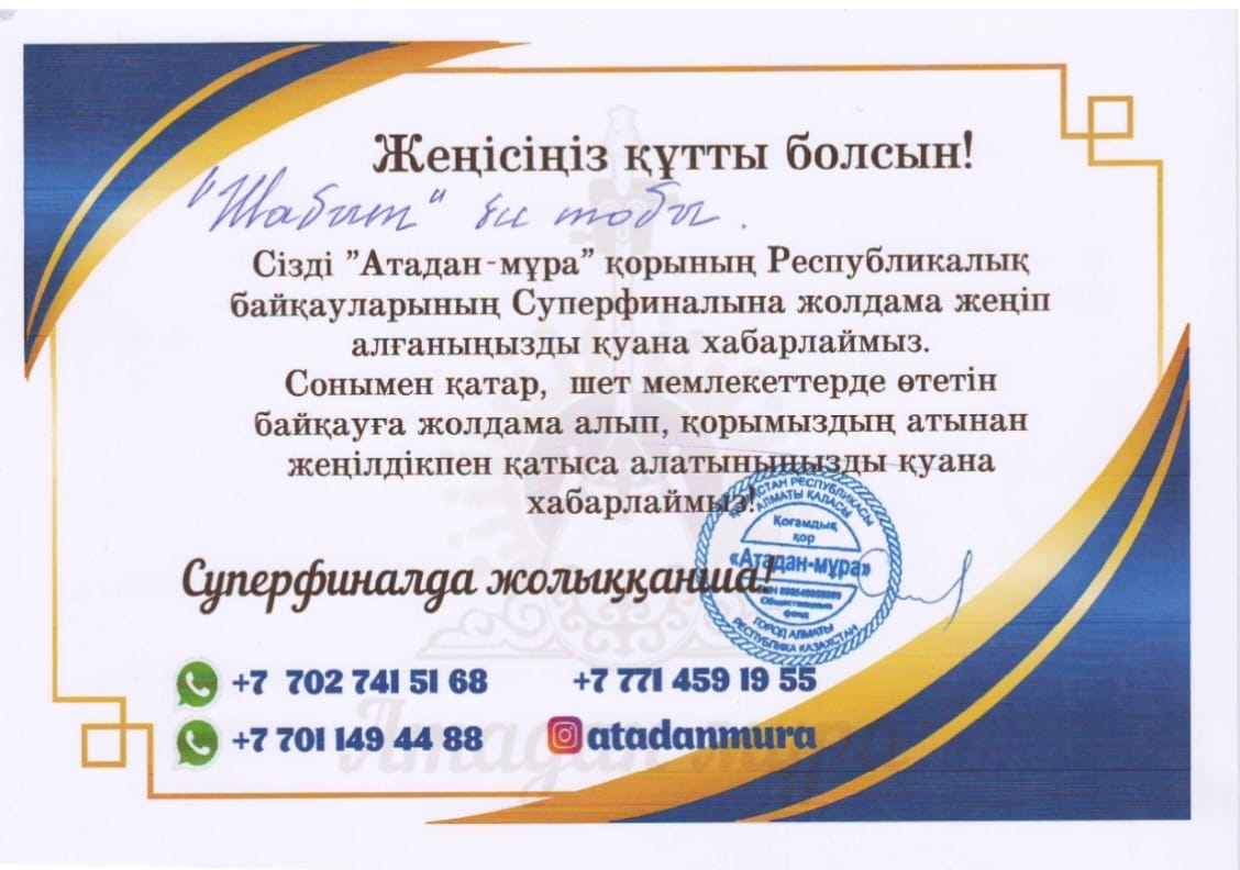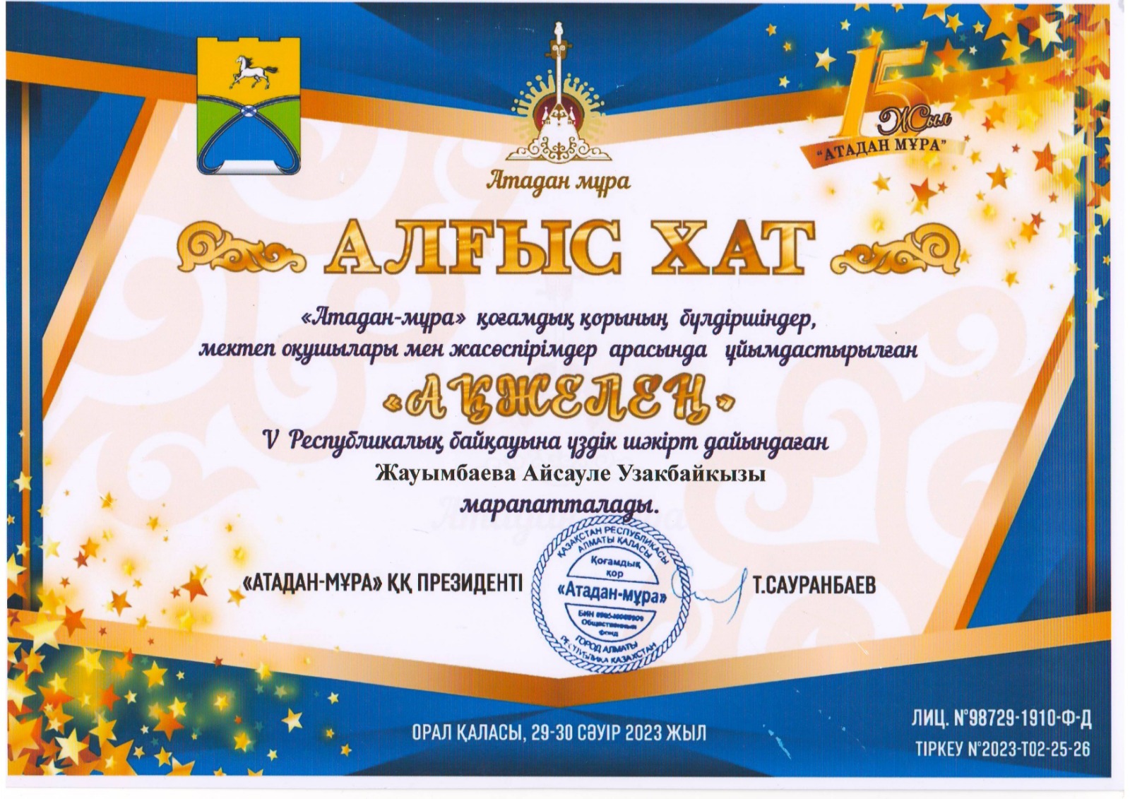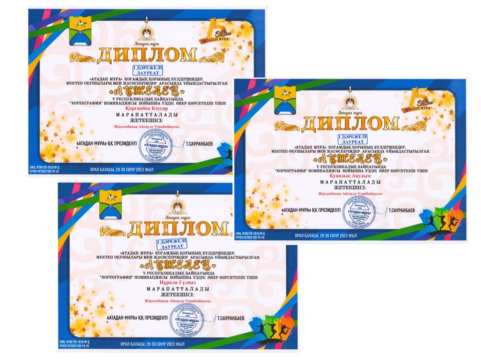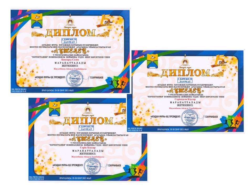 2023 жылы 30 сәуірде "Атадан мұра" қоғамдық қорының ұйымдастыруымен Орал қаласында өткен "Ақжелең" V республикалық байқауының "хореография" номинациясы бойынша "Мектептен тыс білім беру орталығы" МКҚК "Шабыт" үйірмесінің оқушылары қатысып, кіші топ Бас жүлдені иеленіп, суперфиналға жолдама алса, орта топ 1 орынға ие болды. Жеңімпаз оқушылар дипломдармен және кубокпен марапатталды. Жетекшісі: Жауымбаева А.У. алғыс хатпен марапатталды.