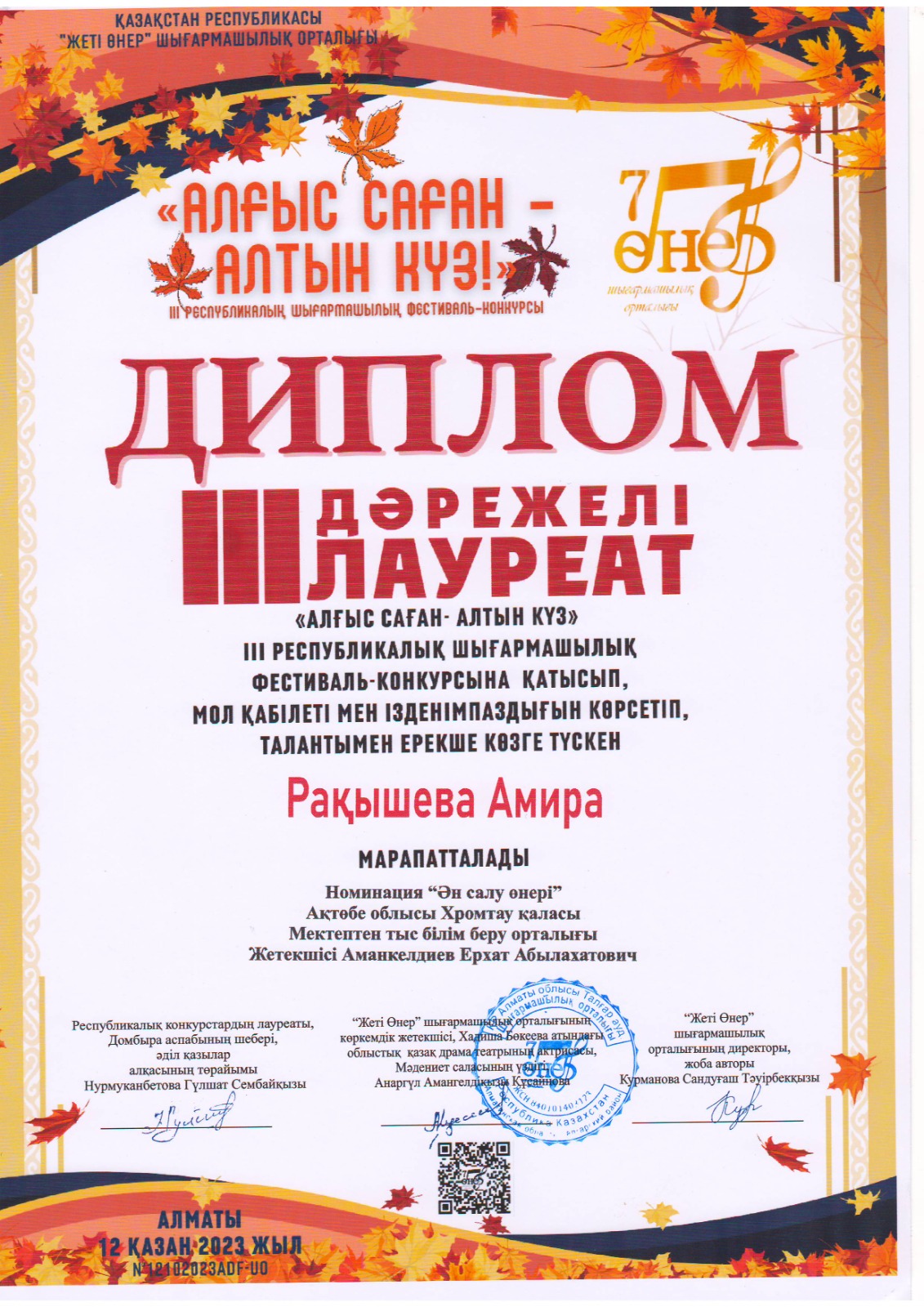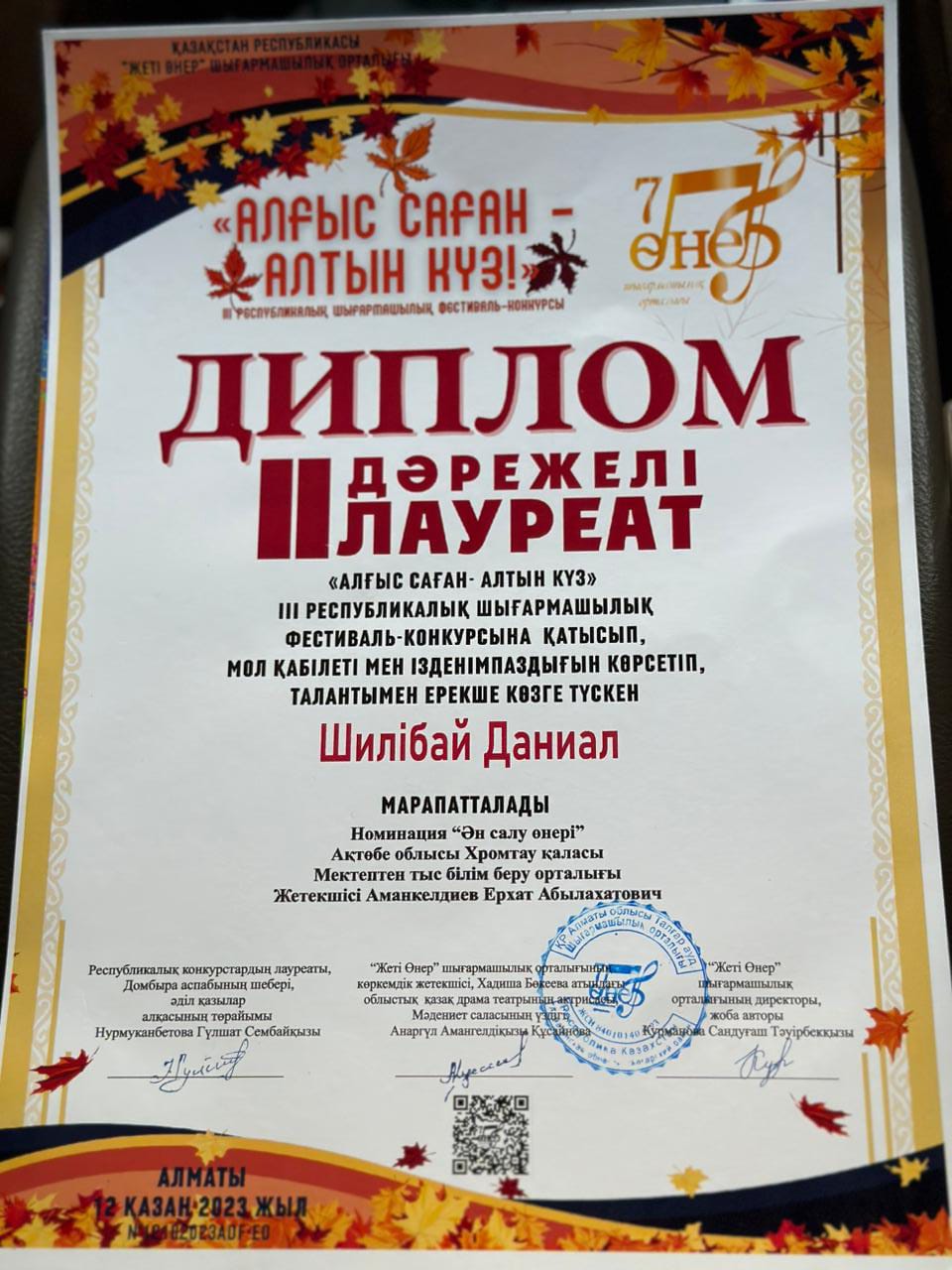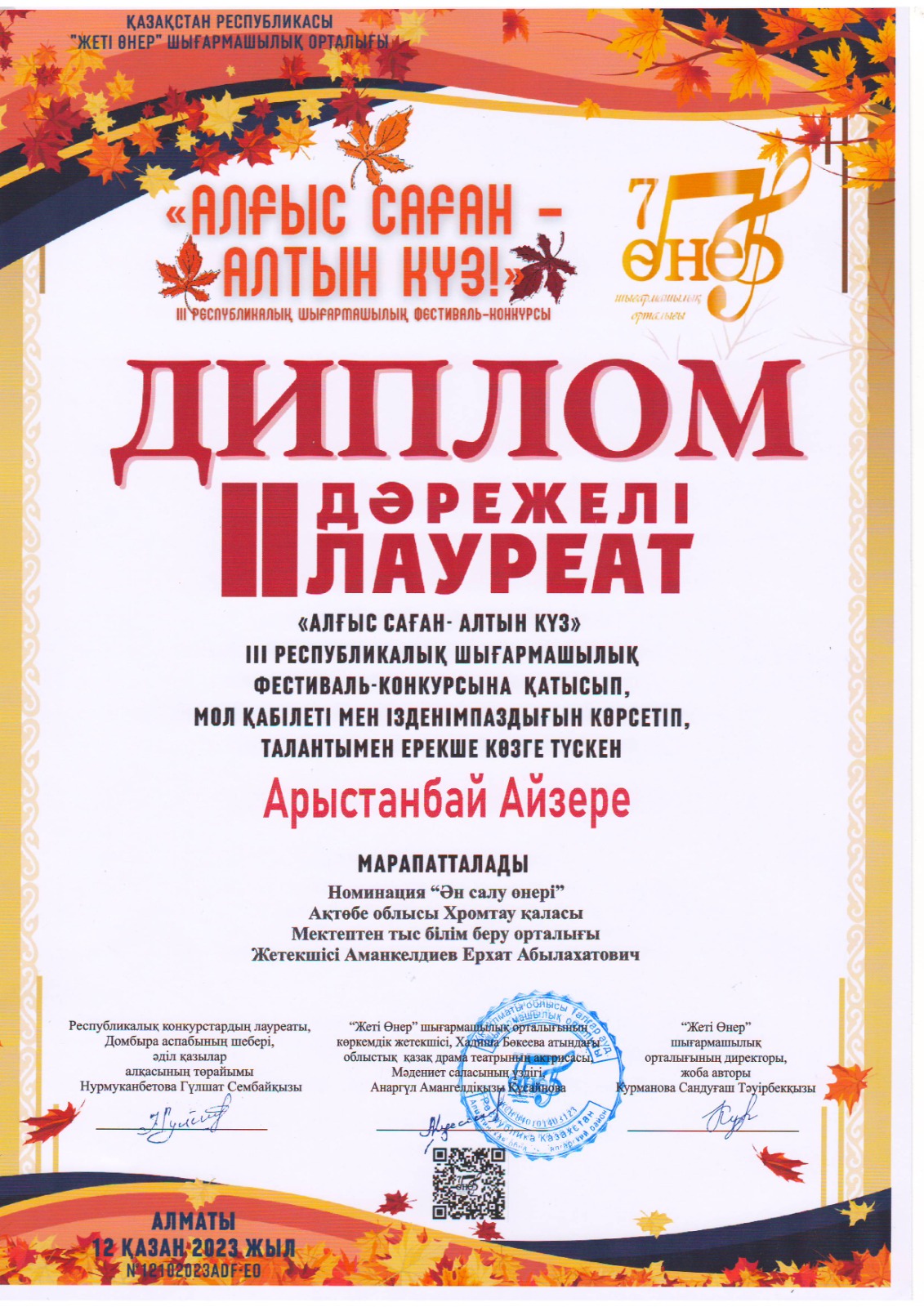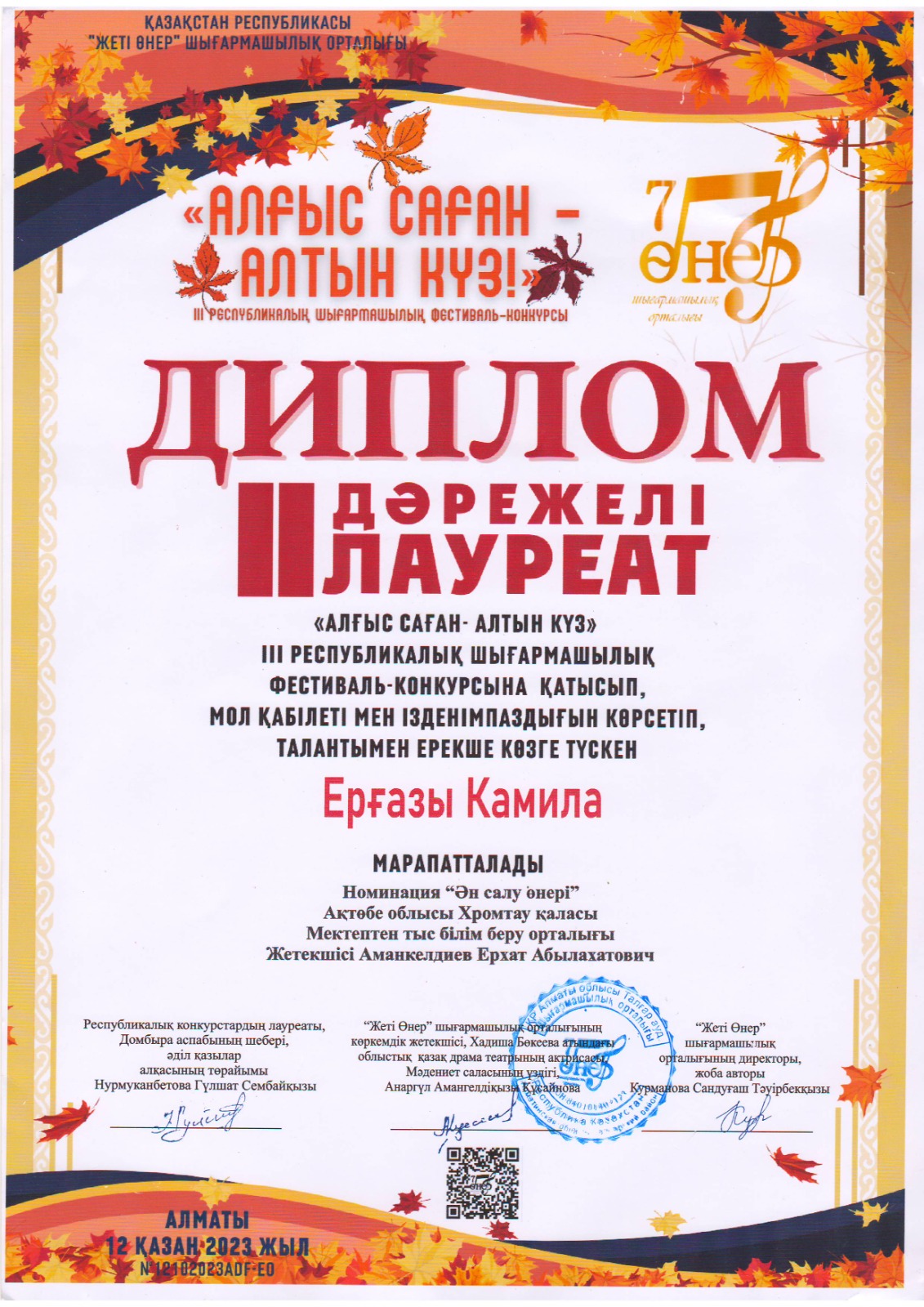 «Алғыс саған-Алтын күз» ІІІ республикалық шығармашылық фестиваль-конкурсына «Мектептен тыс білім беру орталығы» МКҚК «Жалын» вокал үйірмесінің оқушылары қатысып, Бейсен Арай -1 орын, Ерғазы Камила- 2 орын, Арыстанбай Айзере -2 орын, Шилібай Даниал -2 орын, Рақышева Амира -3 орын иеленді.