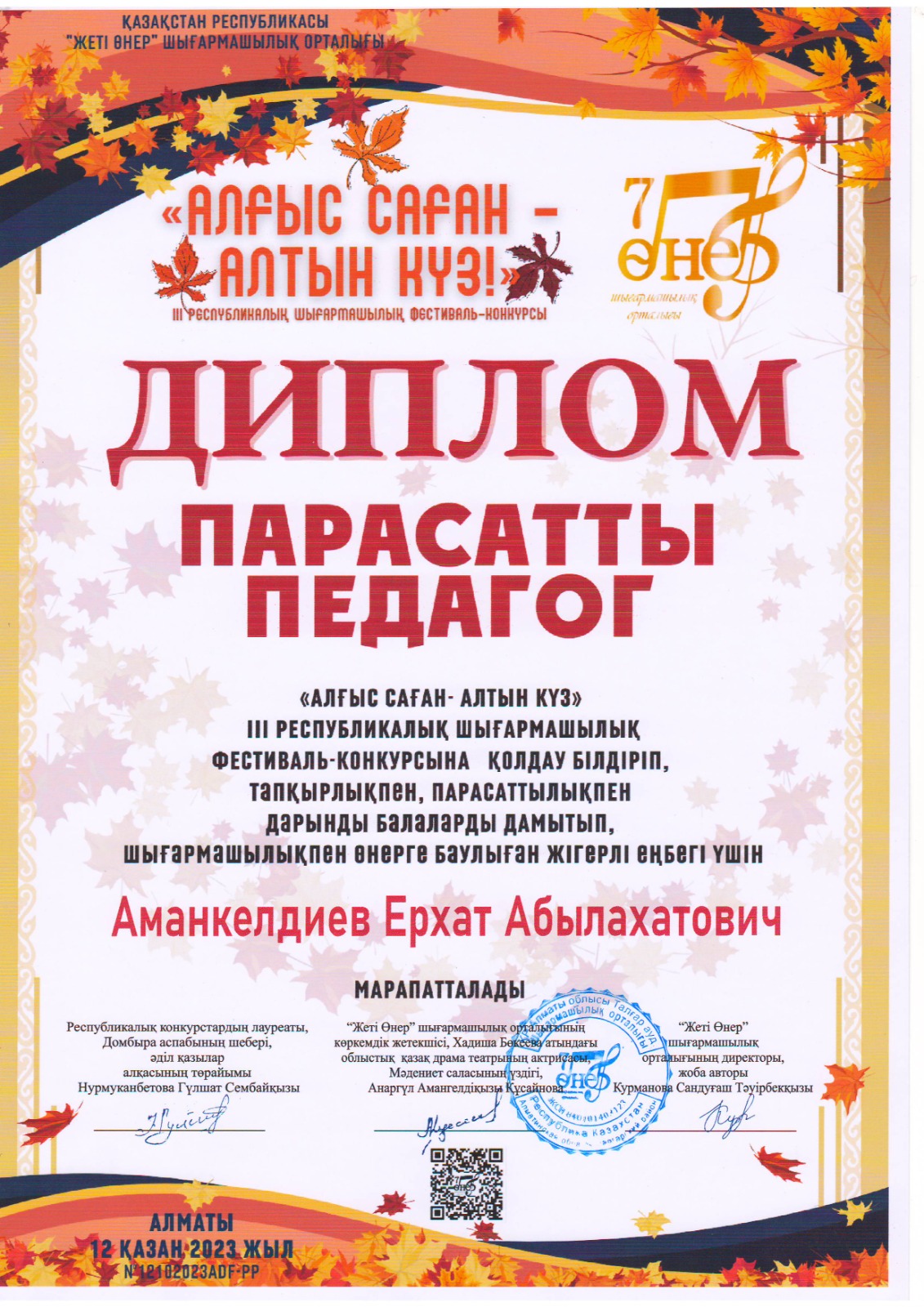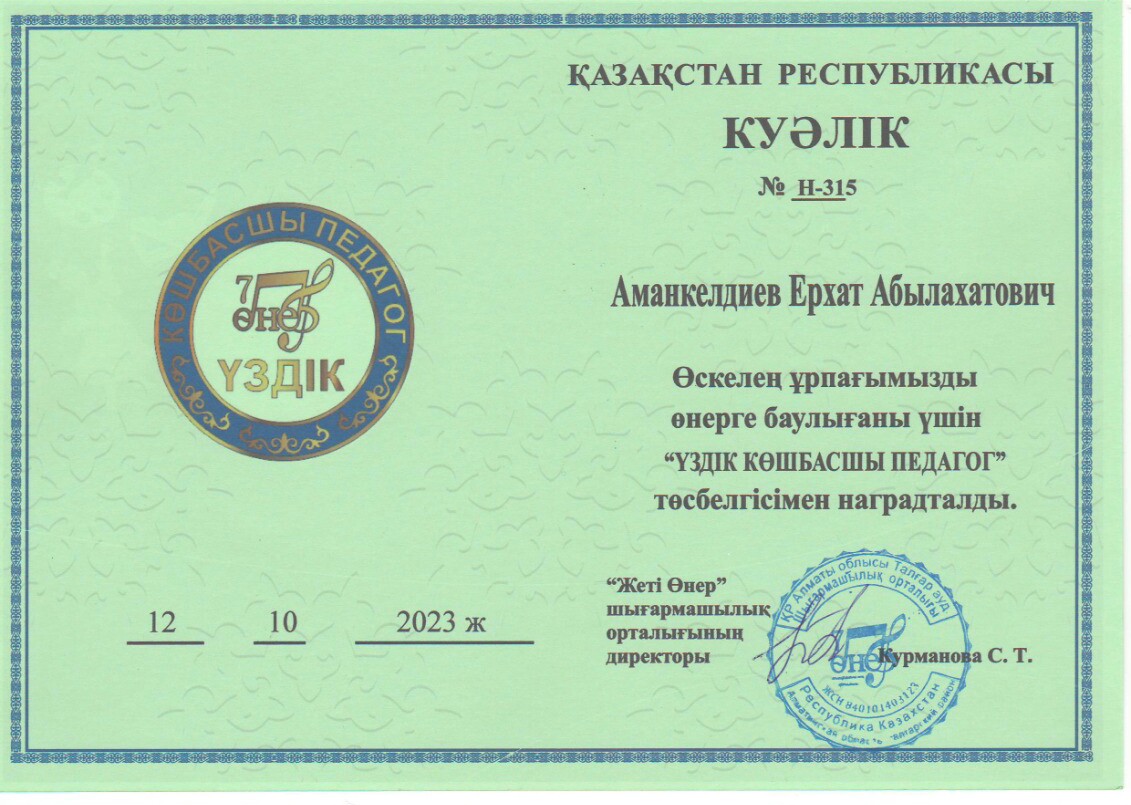 Жетекшісі Аманкелдиев Ерхат Абылахатович дипломмен және «Үздік көшбасшы педагог» төсбелгісімен наградталды.