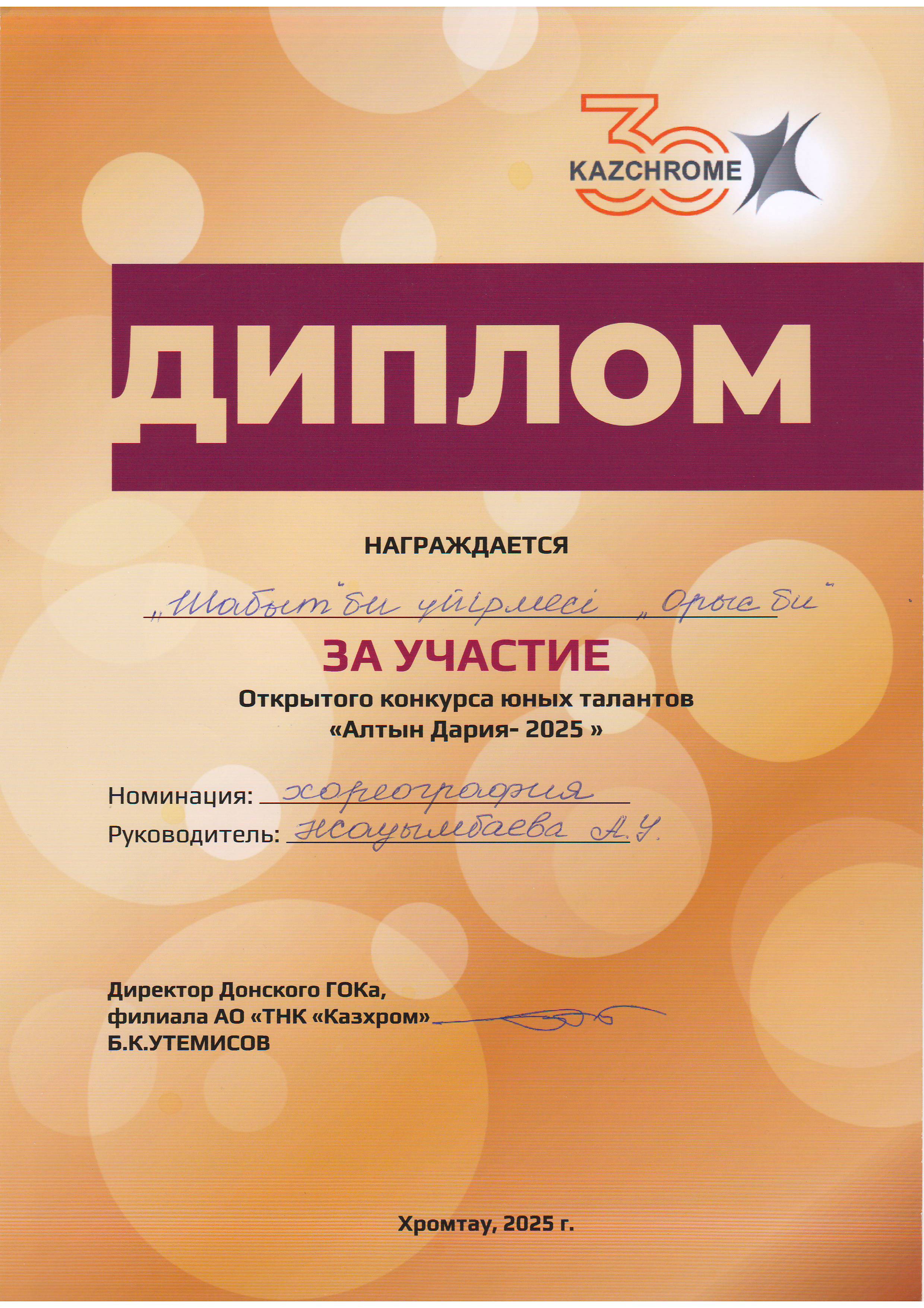 "Шабыт" үйірмесінің жетекшісі Жауымбаева Айсауле Узакбайкызы.