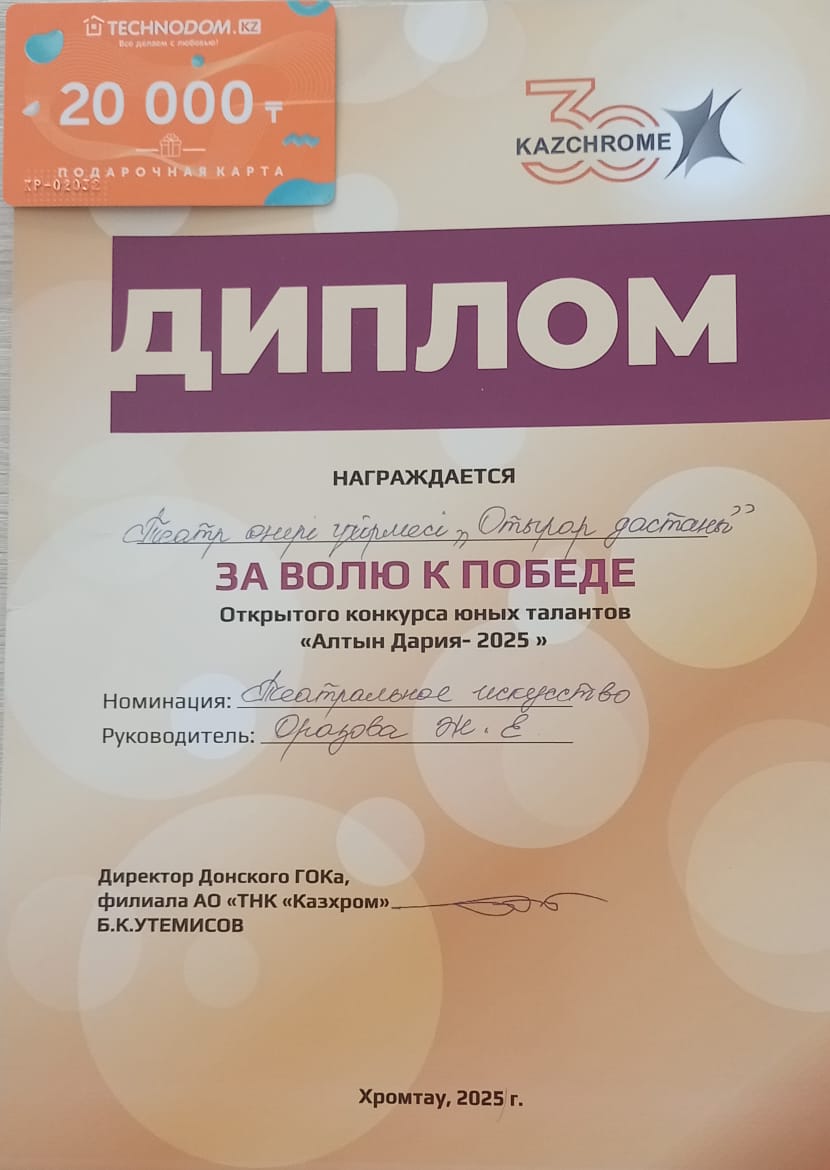 Ағымдағы жылдың 16 ақпанында Кеншілер мәдениет үйі ұйымдастырған "Алтын дария" атты байқауында "Театр өнері" үйірмесі оқушылары үздік өнер көрсетіп, "Жеңіске деген ерік - жігері үшін" номинациясы мен сыйлық 20 000 тг сертификат иеленді. Олар: