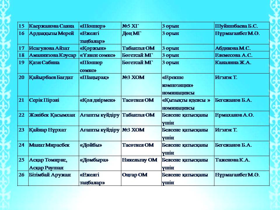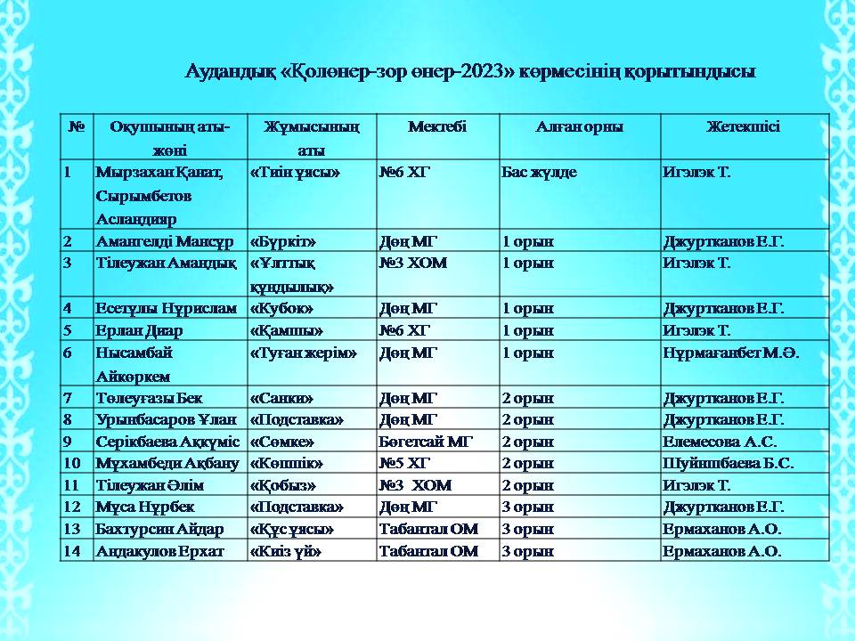 2023 жылы 28 сәуірде "Мектептен тыс білім беру орталығы" МКҚК ұйымдастыруымен аудандық "Қолөнер-зор өнер" көрмесі өткізілді. Көрменің мақсаты: балалар қолөнер шығармашылығын дамыту мен насихаттау, олардың қызығушылығын одан әрі арттыру. Көрмеге барлығы 9 мектеп қатысып, 65 жұмыс қойылды. Үздік жұмыстар аудандық білім бөлімінің мадақтамасымен марапатталды.