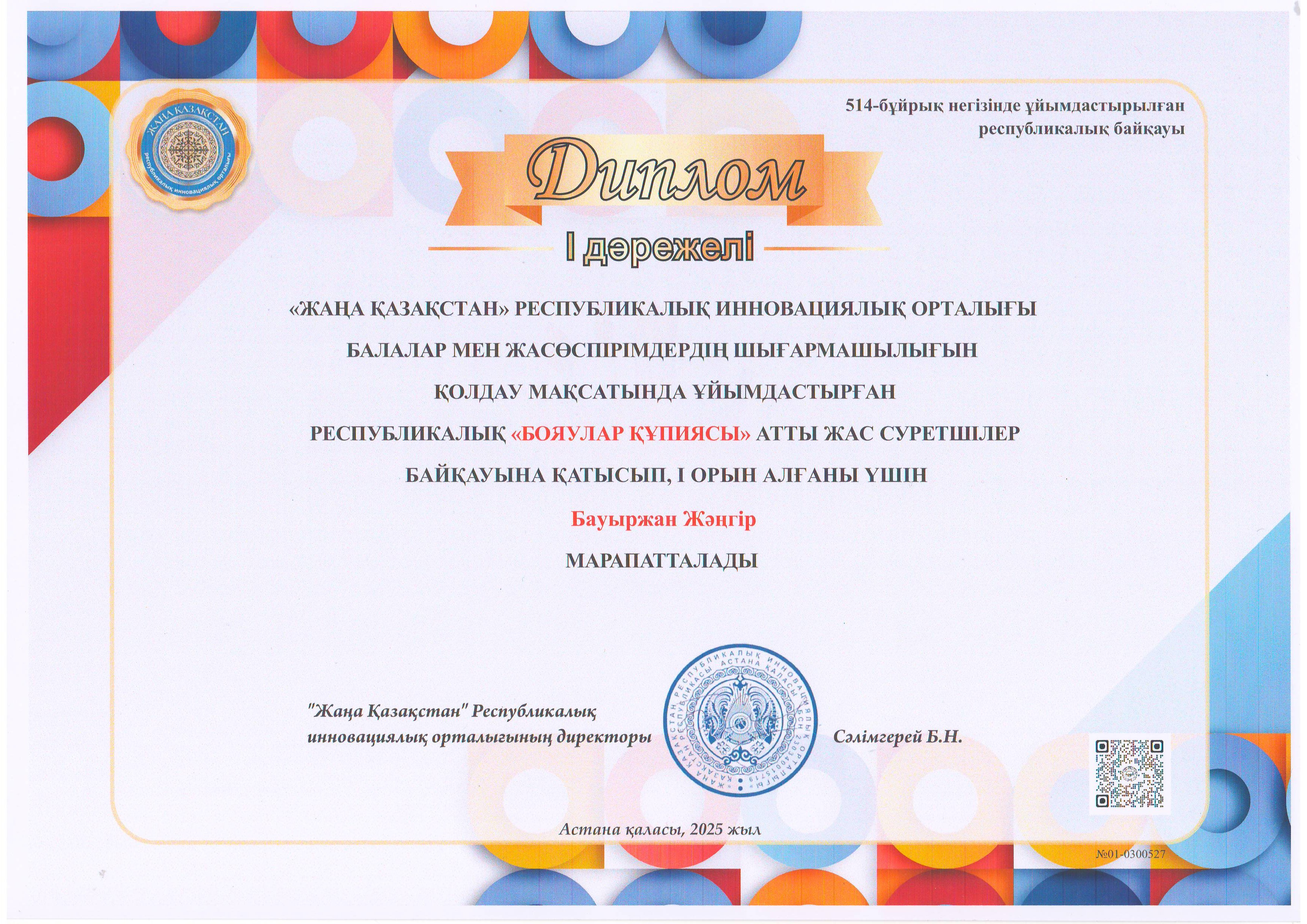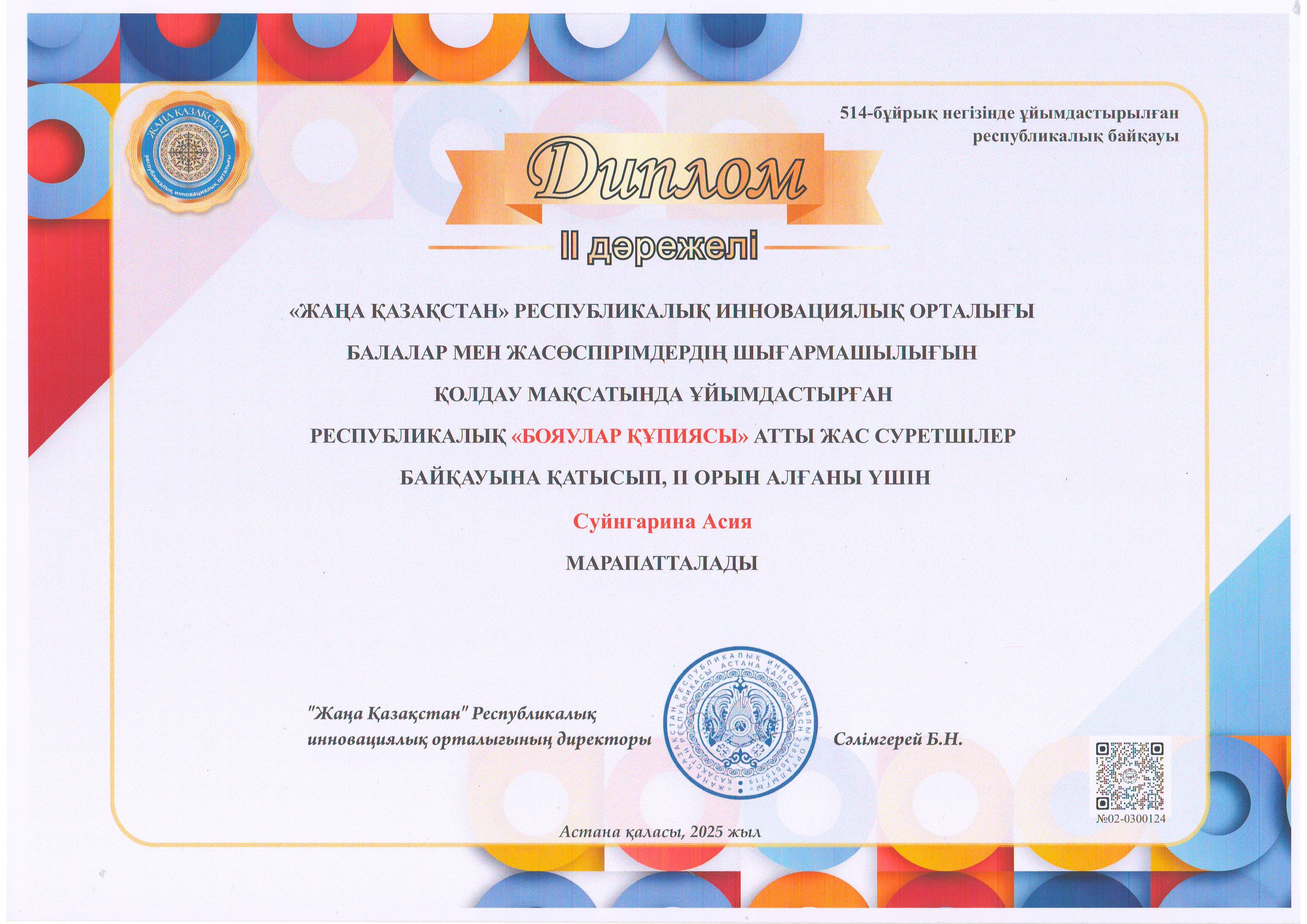 "Жаңа Қазақстан" Республикалық инновациялық орталығы балалар мен жасөспірімдердің шығармашылығын қолдау мақсатында ұйымдастырған республикалық "Бояулар құпиясы" байқауына "Жас суретші" үйірмесінің оқушылары қатысып, Бауыржан Жәңгір, Аманғос Ақерке, Қыдырбек Айдана, Махмет Ару І орын дипломдарын иеленсе, Суйнгарина Асия ІІ орын дипломын иеленді.