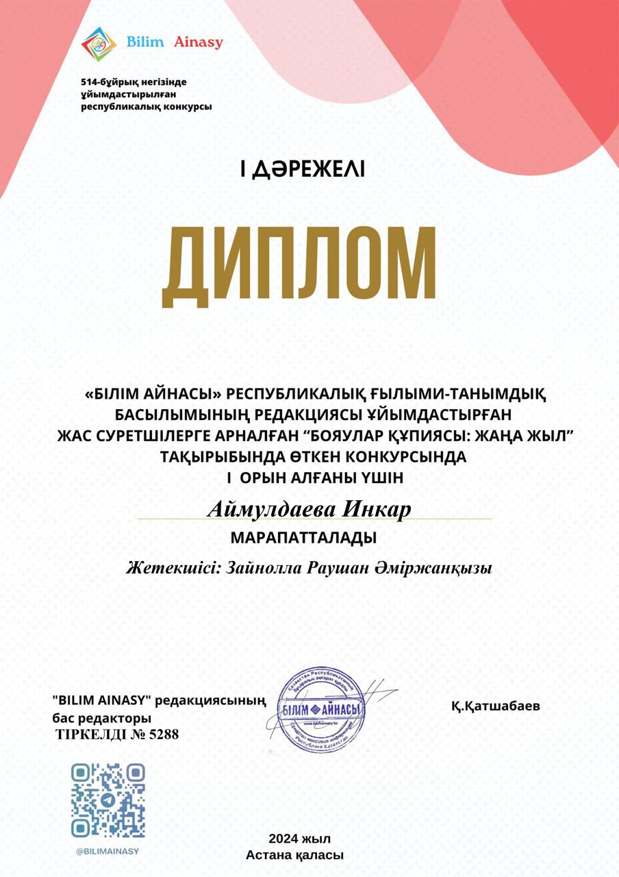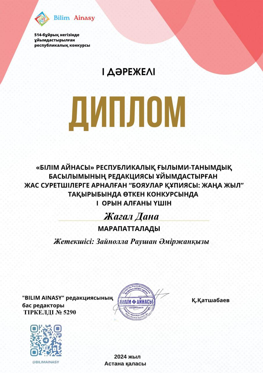 «Білім айнасы» республикалық ғылыми - танымдық басылымының редакциясы ұйымдастырған «Бояулар құпиясы: жаңа жыл» тақырыбында өткен байқауға «Мектептен тыс білім беру орталығы» МКҚК - ның «Волшебная кисточка» үйірмесінің оқушылары қатысып, жүлделі орындар иеленді.