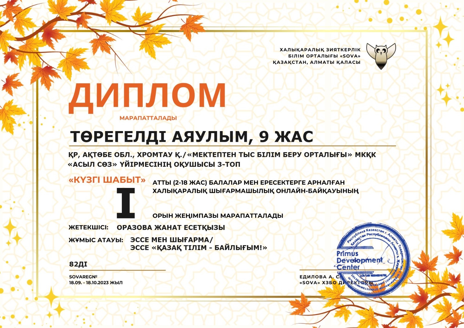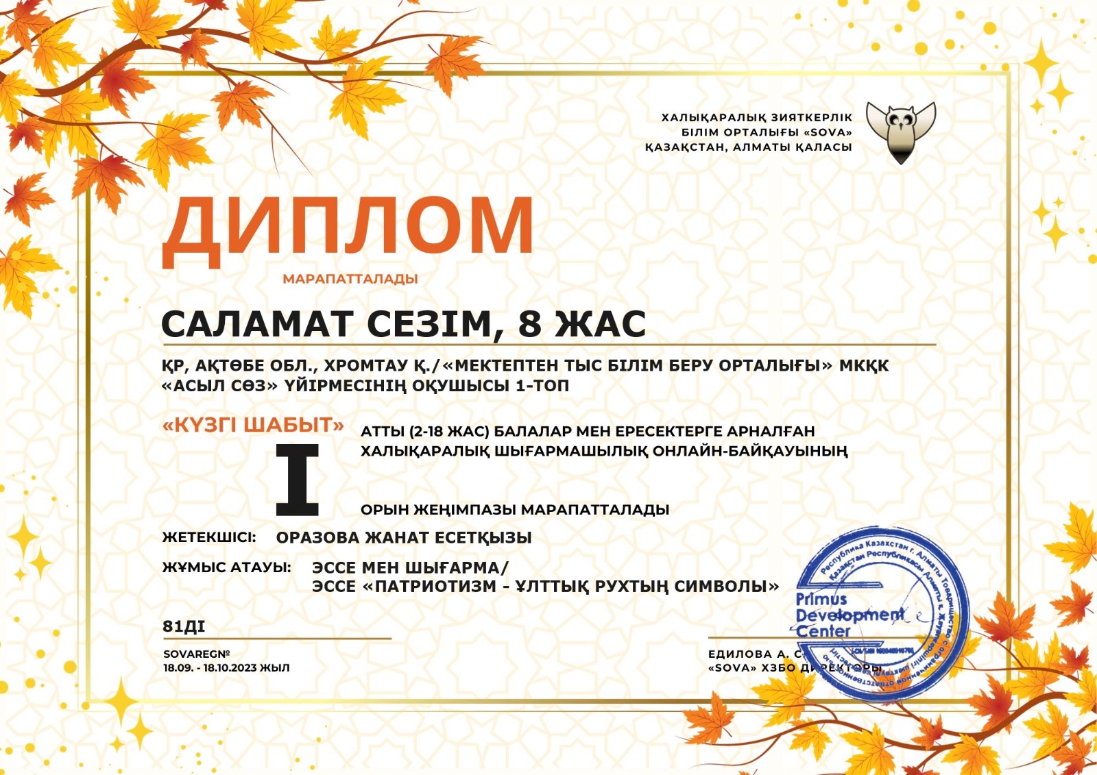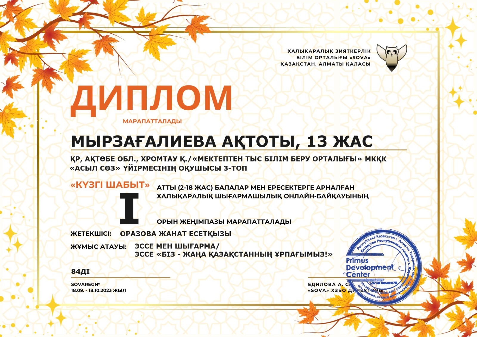 "Мектептен тыс білім беру орталығы" МКҚК "Асыл сөз" үйірмесінің оқушылары "Күзгі шабыт" атты балалар мен ересектерге арналған халықаралық шығармашылық онлайн-байқауына қатысып, Мырзағалиева Ақтоты 1-орын, Төрегелді Аяулым 1-орын, Қуандық Аяулым 1-орын, Саламат Сезім 1-орын иеленіп, дипломмен марапатталды.