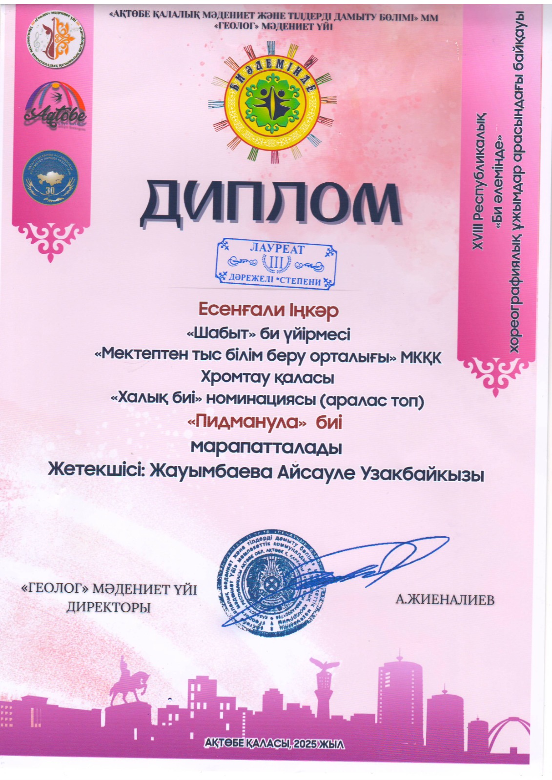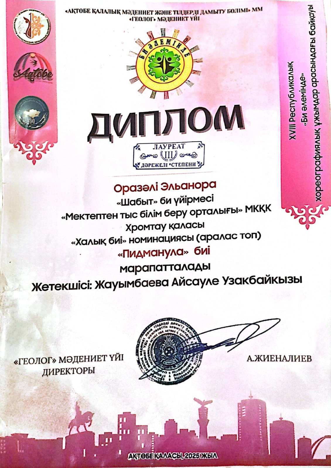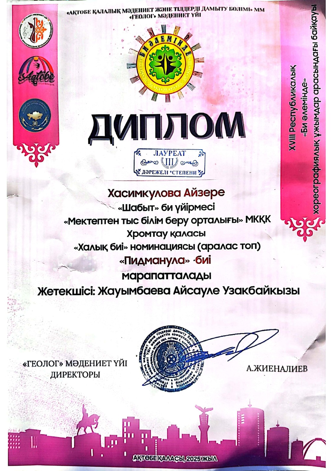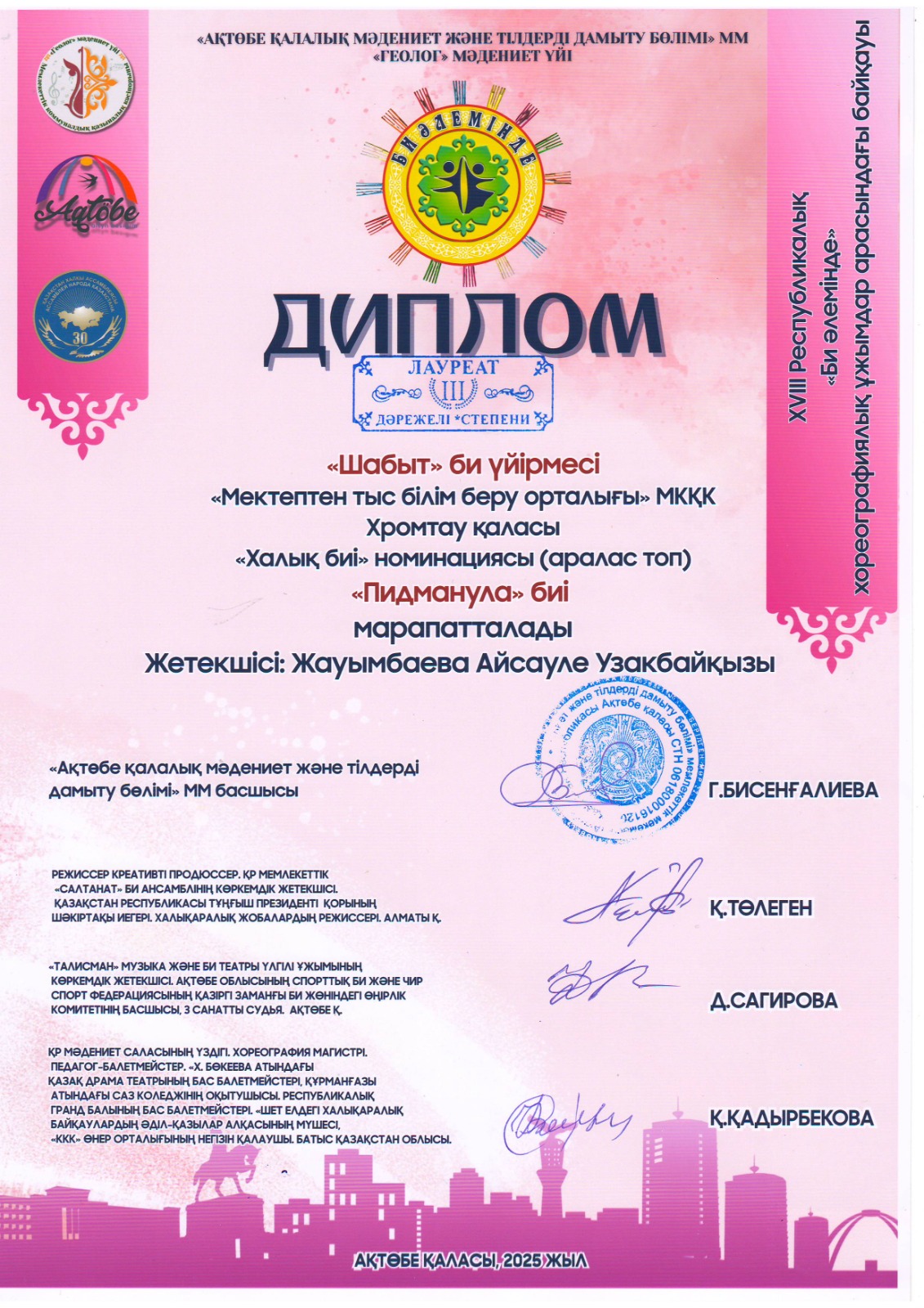 Мектептен тыс білім беру орталығының "Шабыт" үйірмесінің оқушылары Ақтөбе қаласында Қазақстан халқы ассамблеясының құрылғанына 30 жыл толуына орай хореографиялық ұжымдар арасында өткен ХVIII республикалық "Би әлемінде-2025" байқауына қатысып, жүлделі ІІІ орынға ие болды.