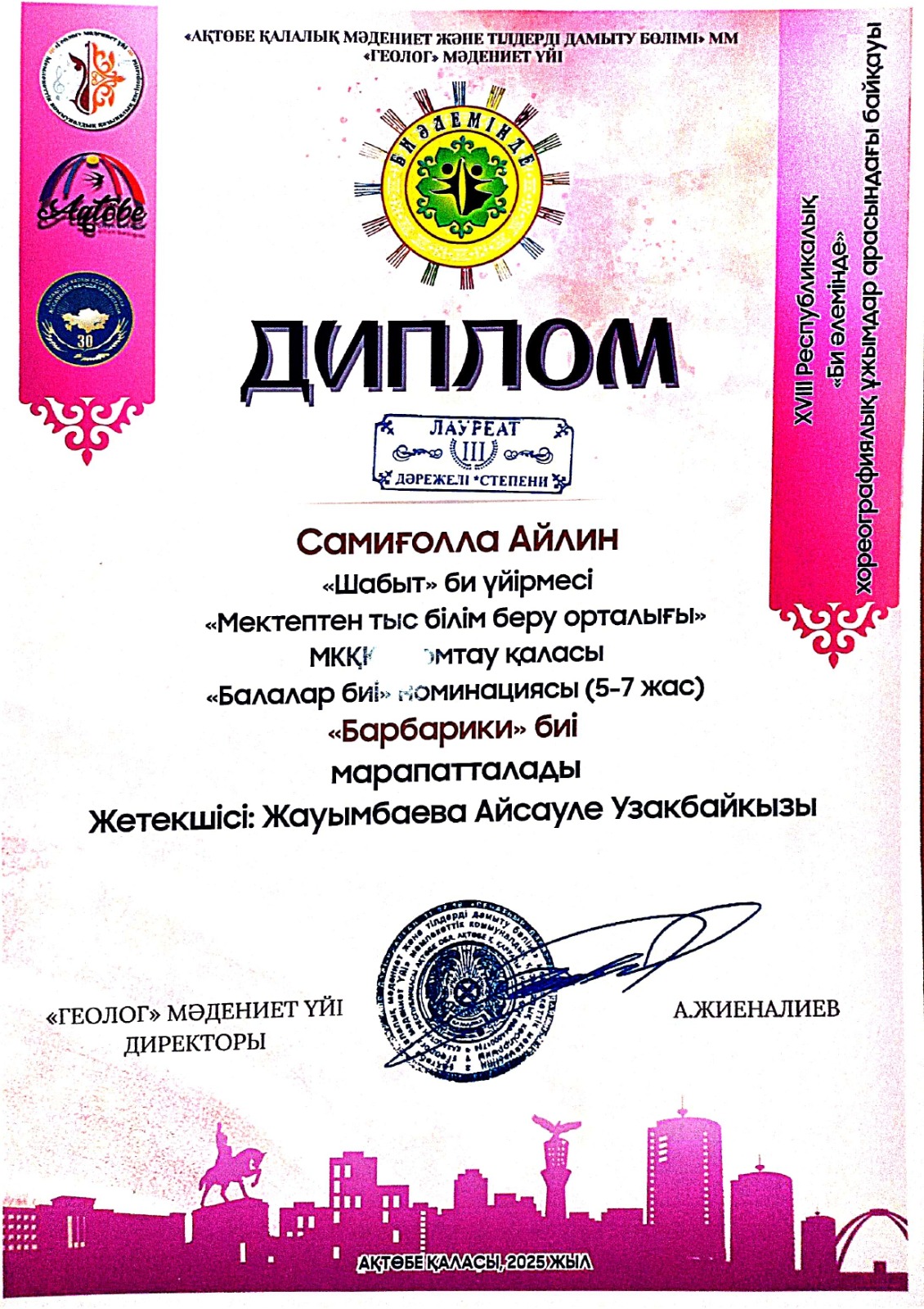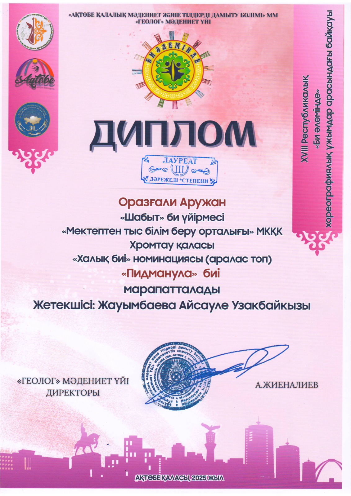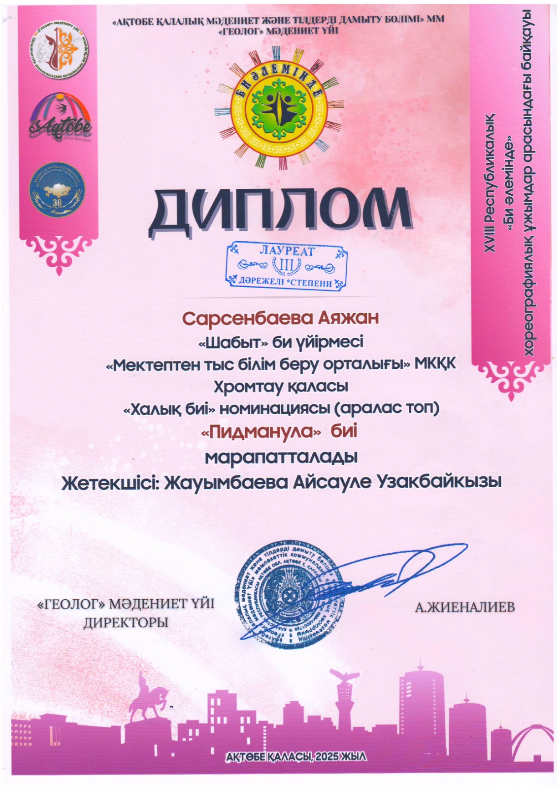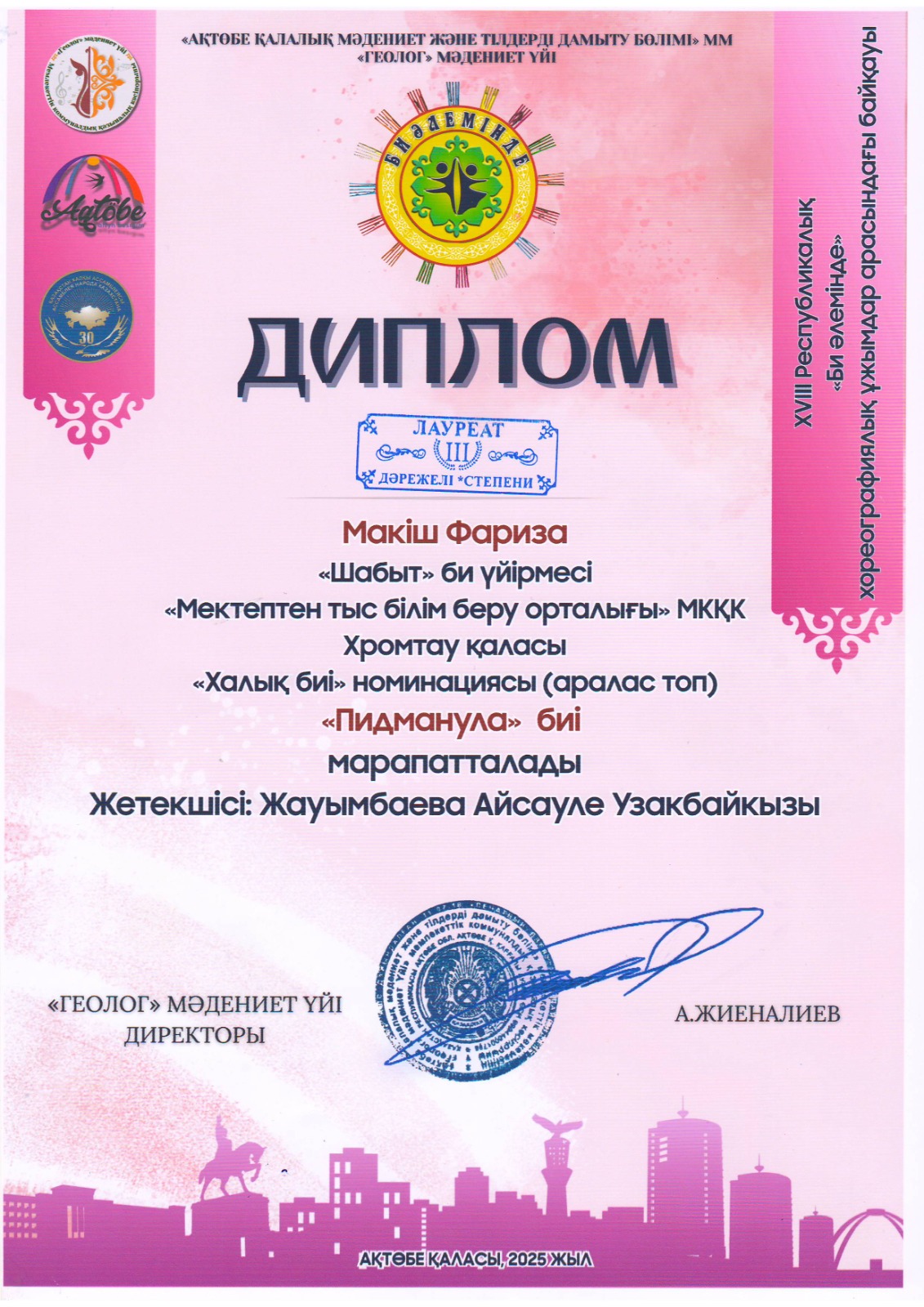 Мектептен тыс білім беру орталығының "Шабыт" үйірмесінің оқушылары Ақтөбе қаласында Қазақстан халқы ассамблеясының құрылғанына 30 жыл толуына орай хореографиялық ұжымдар арасында өткен ХVIII республикалық "Би әлемінде-2025" байқауына қатысып, жүлделі ІІІ орынға ие болды.