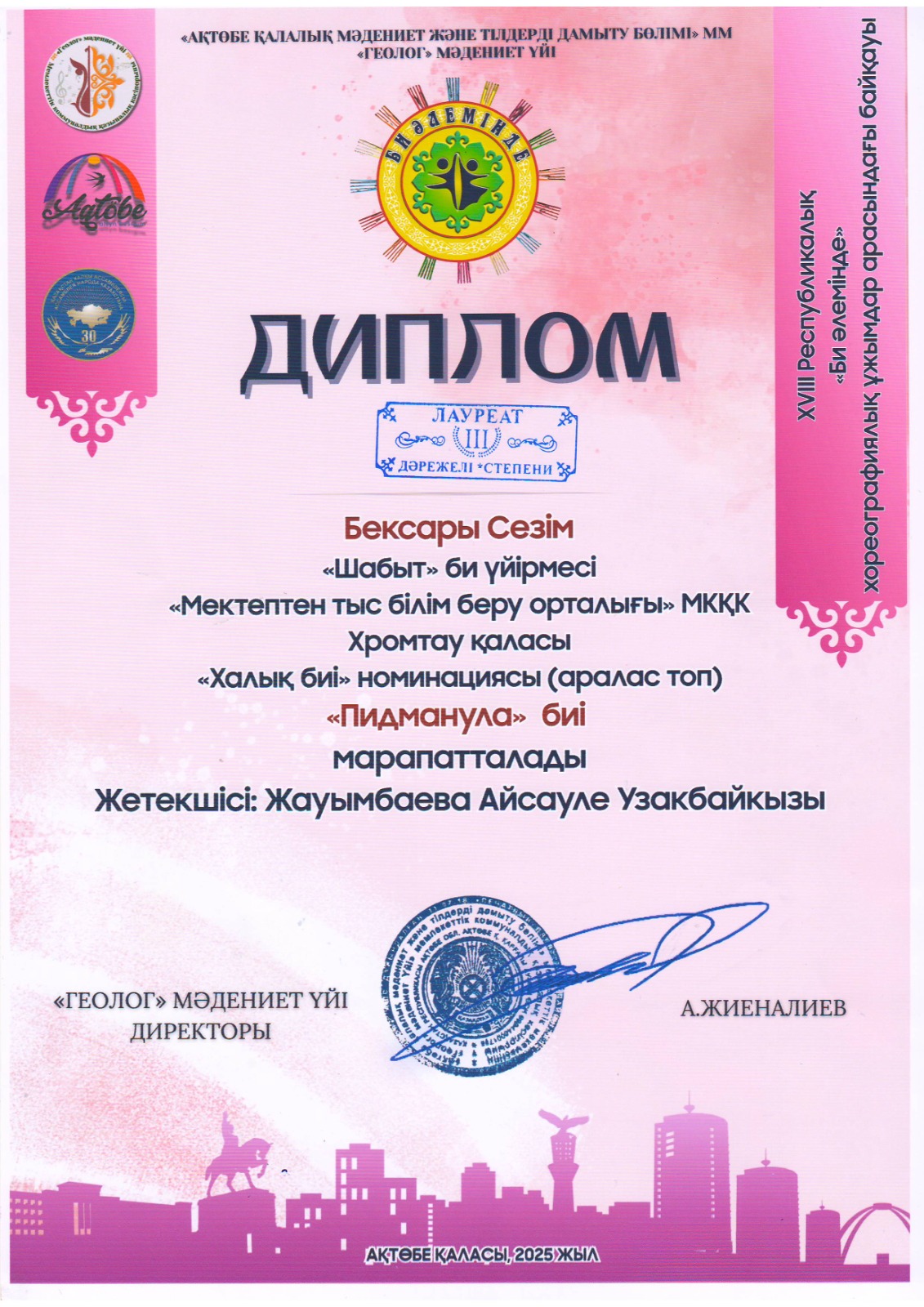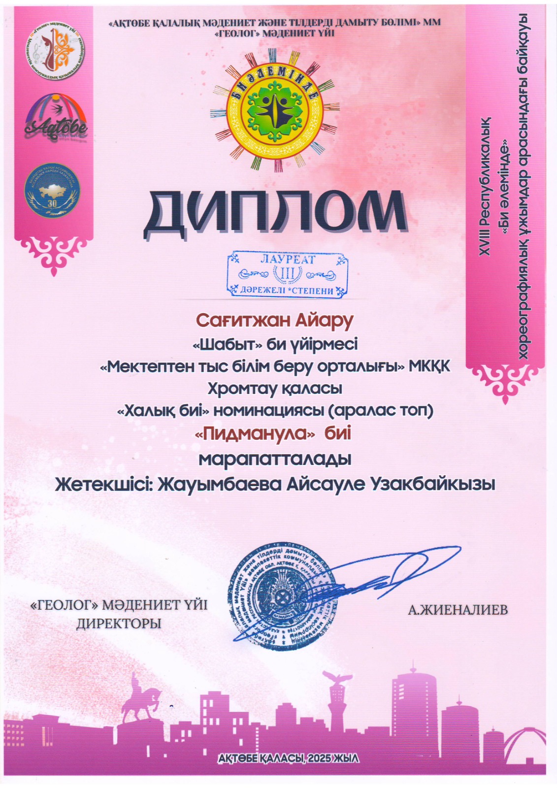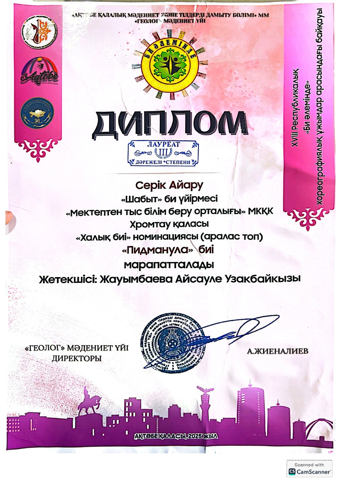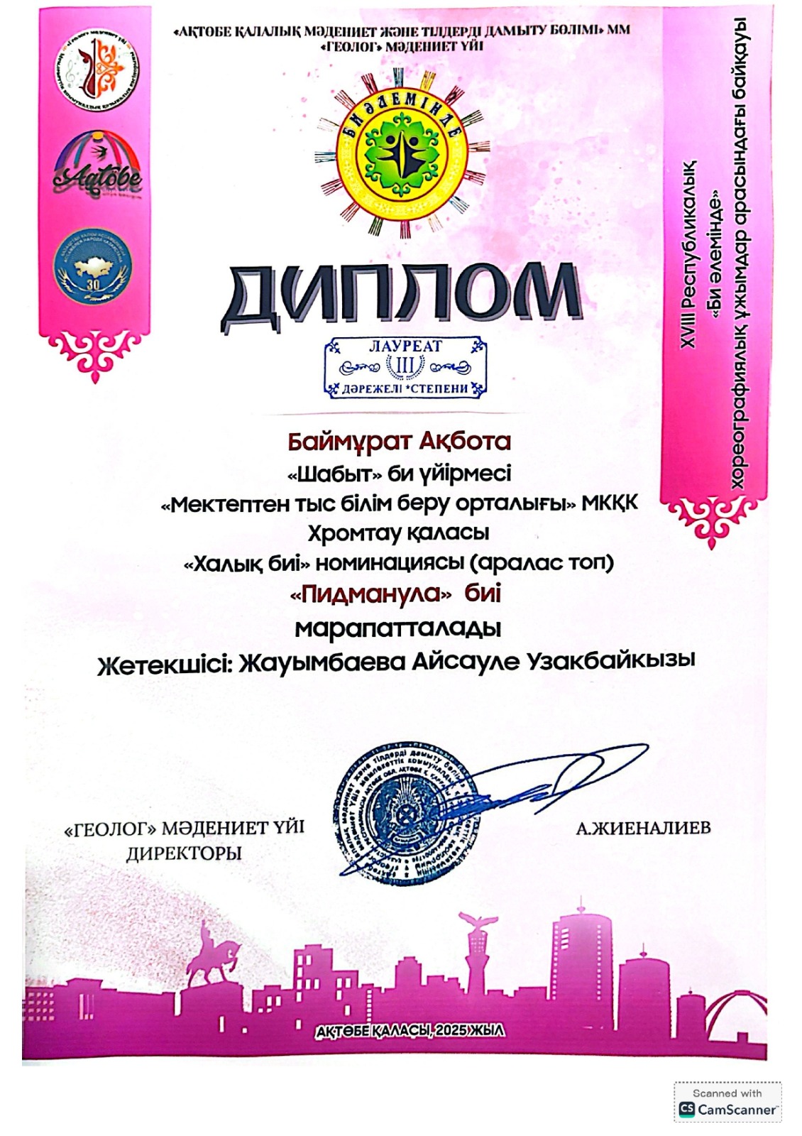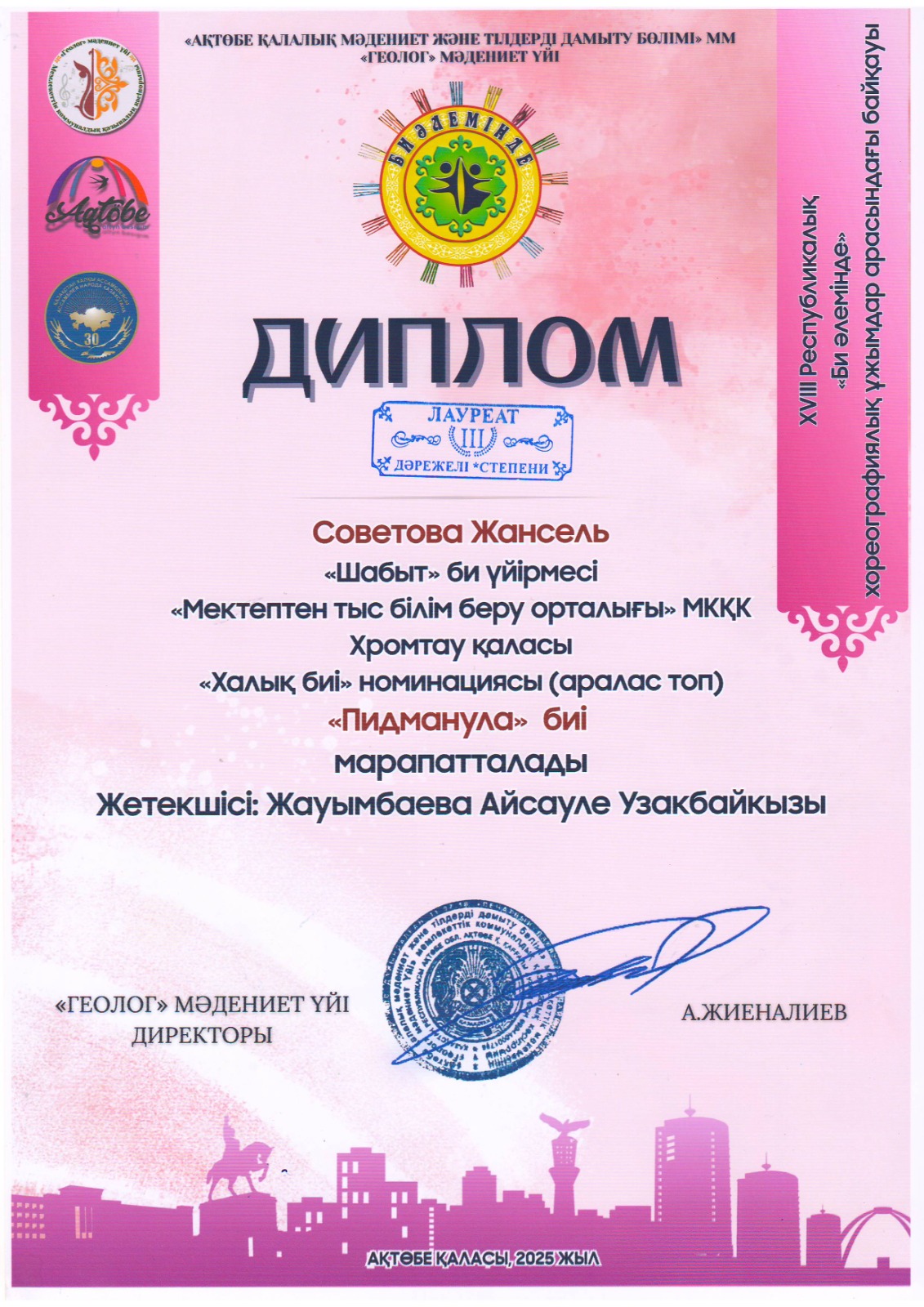 Мектептен тыс білім беру орталығының "Шабыт" үйірмесінің оқушылары Ақтөбе қаласында Қазақстан халқы ассамблеясының құрылғанына 30 жыл толуына орай хореографиялық ұжымдар арасында өткен ХVIII республикалық "Би әлемінде-2025" байқауына қатысып, жүлделі ІІІ орынға ие болды.