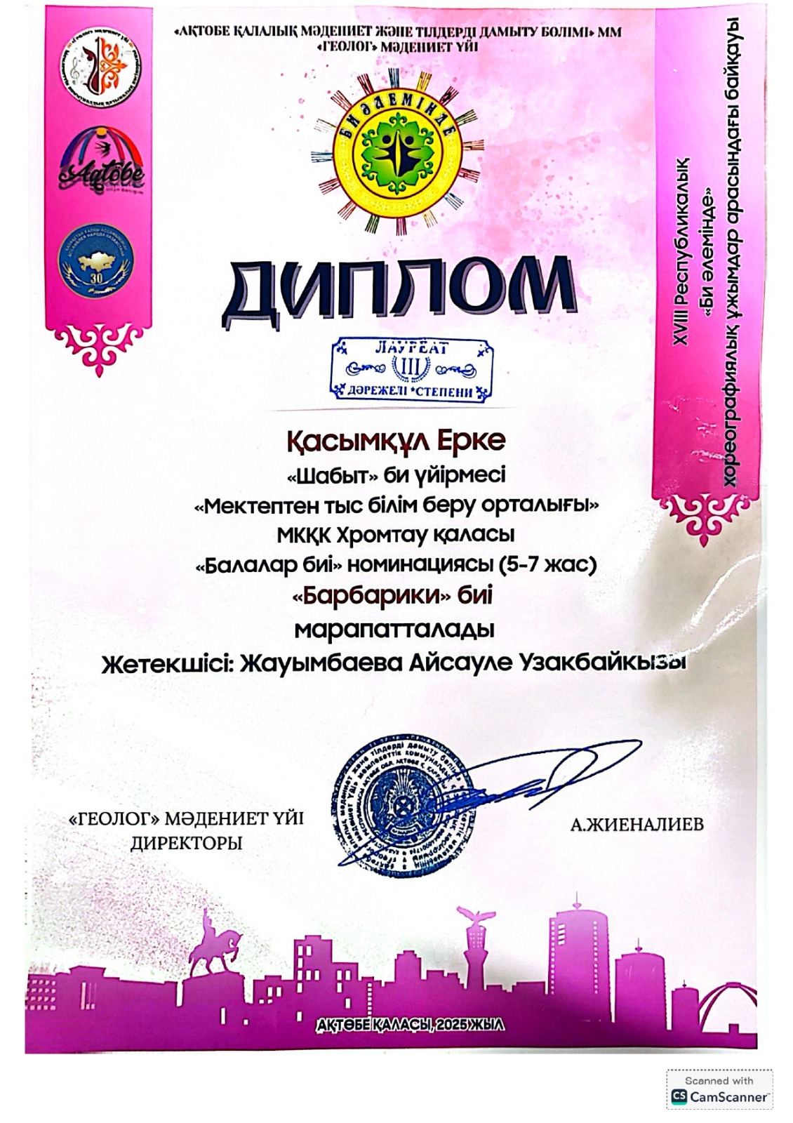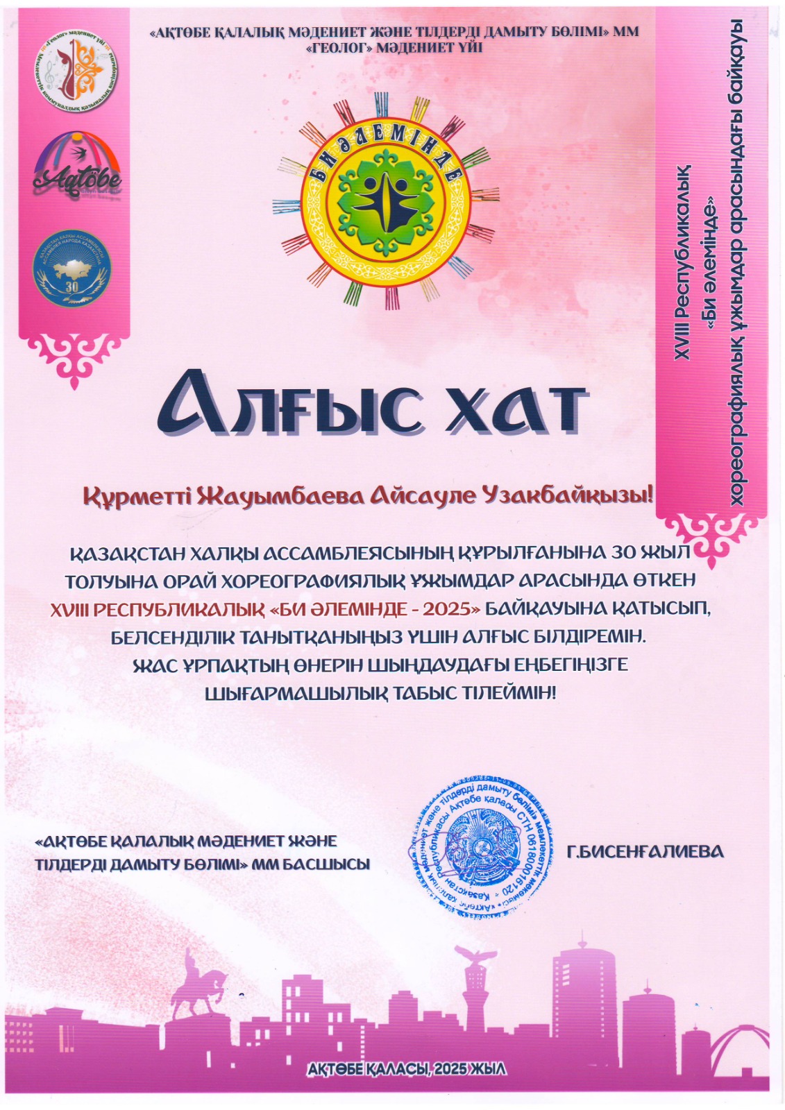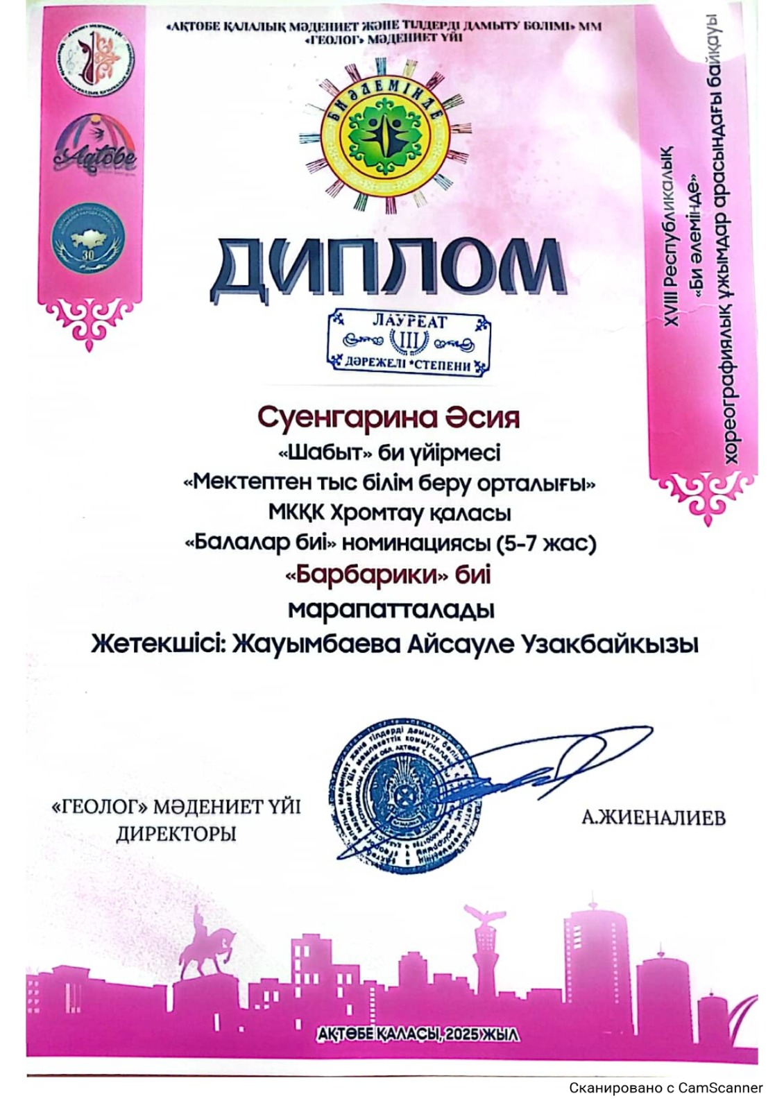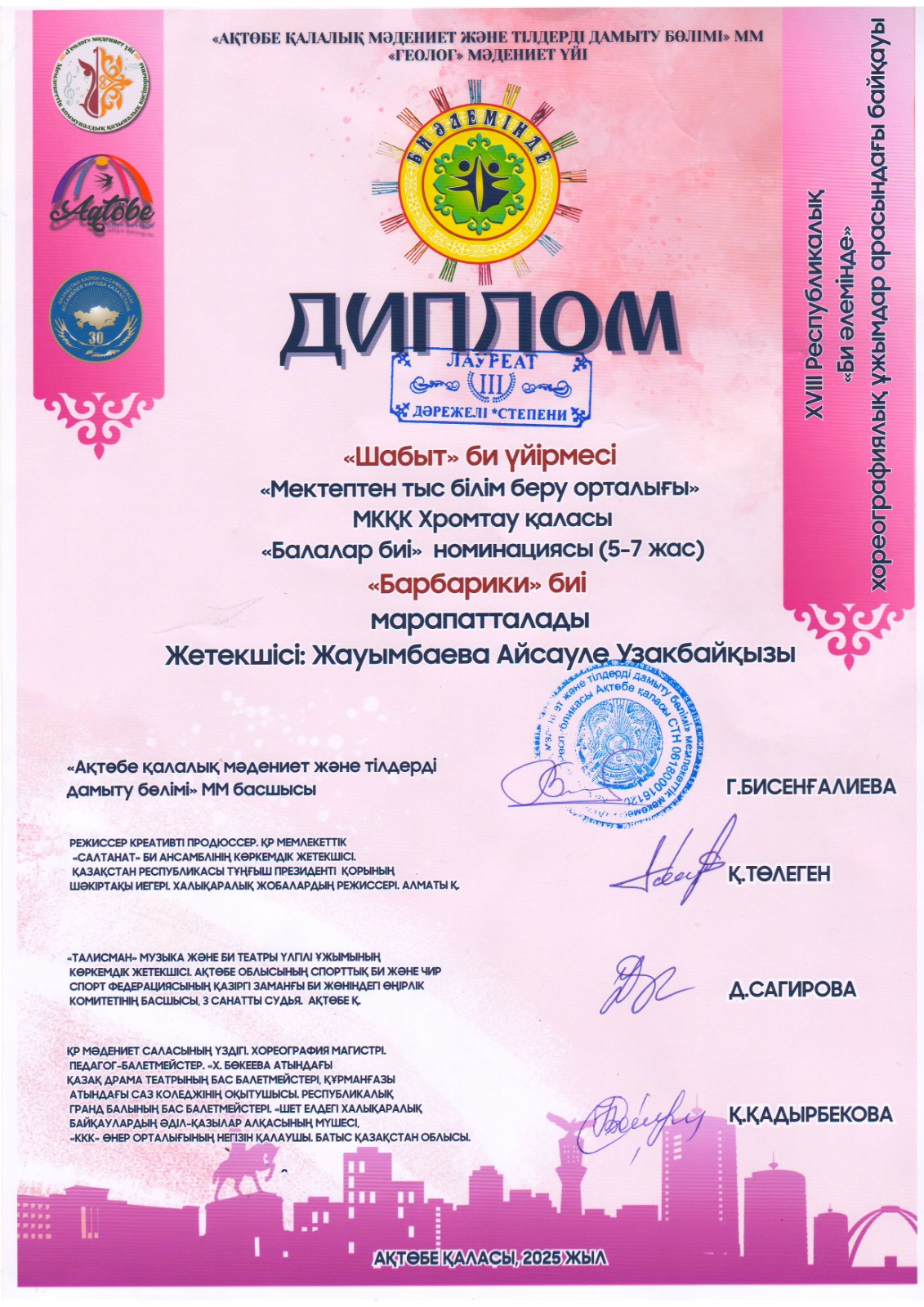 Мектептен тыс білім беру орталығының "Шабыт" үйірмесінің оқушылары Ақтөбе қаласында Қазақстан халқы ассамблеясының құрылғанына 30 жыл толуына орай хореографиялық ұжымдар арасында өткен ХVIII республикалық "Би әлемінде-2025" байқауына қатысып, жүлделі ІІІ орынға ие болды.