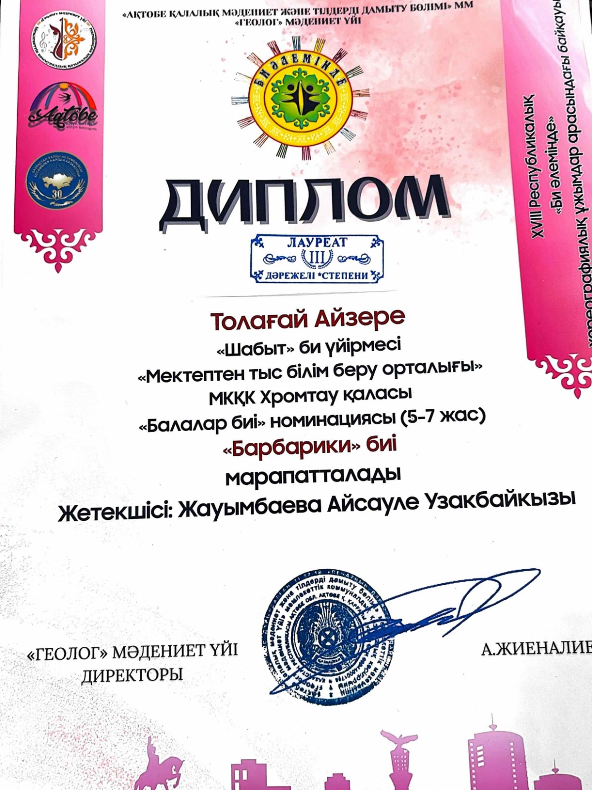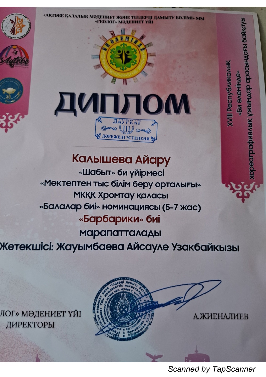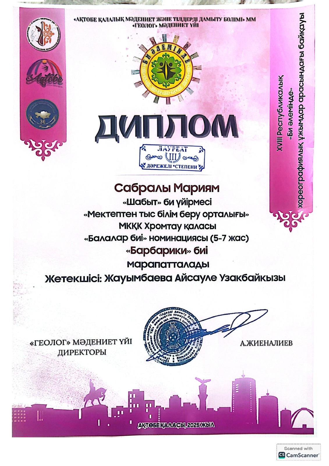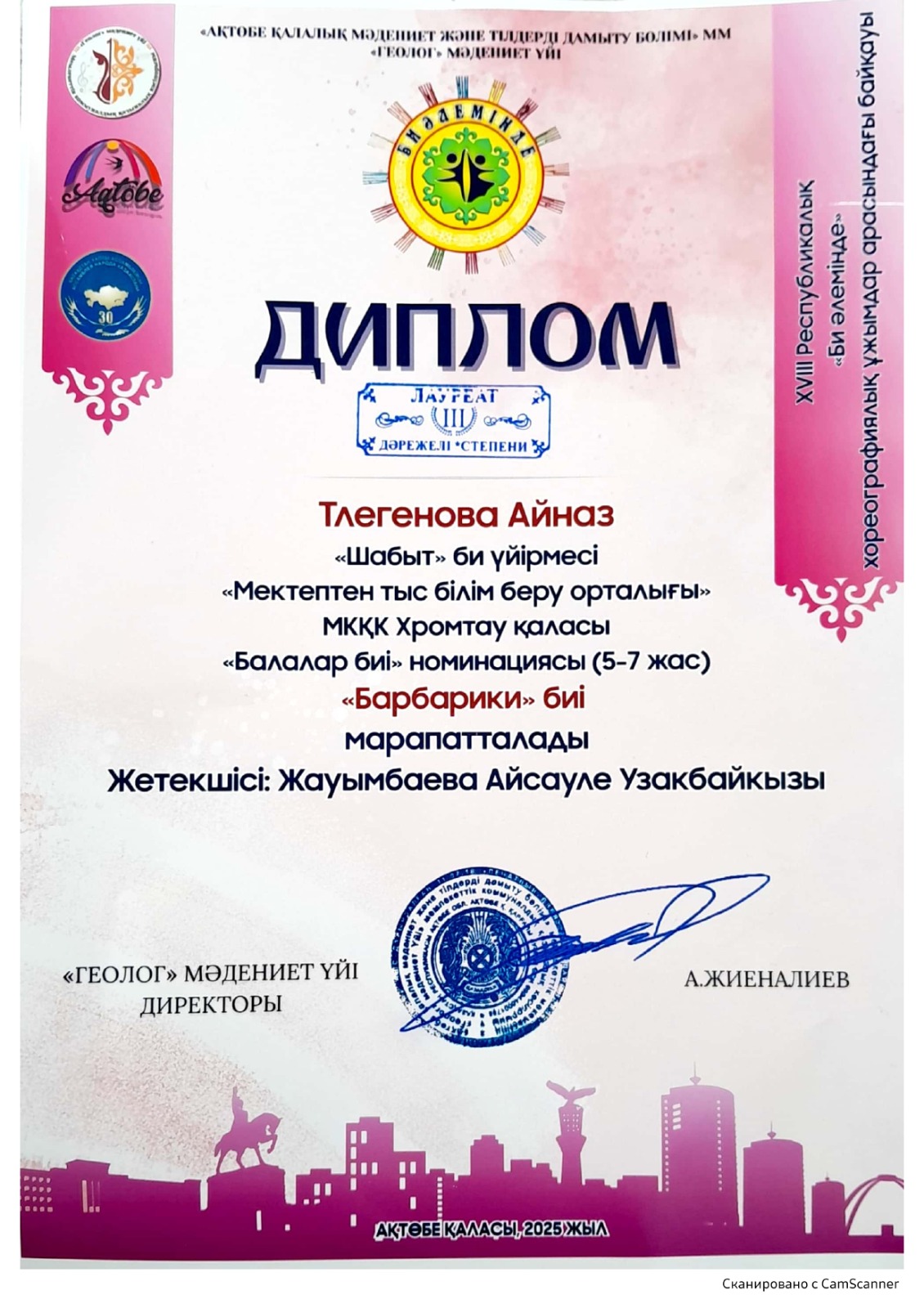 Мектептен тыс білім беру орталығының "Шабыт" үйірмесінің оқушылары Ақтөбе қаласында Қазақстан халқы ассамблеясының құрылғанына 30 жыл толуына орай хореографиялық ұжымдар арасында өткен ХVIII республикалық "Би әлемінде-2025" байқауына қатысып, жүлделі ІІІ орынға ие болды.