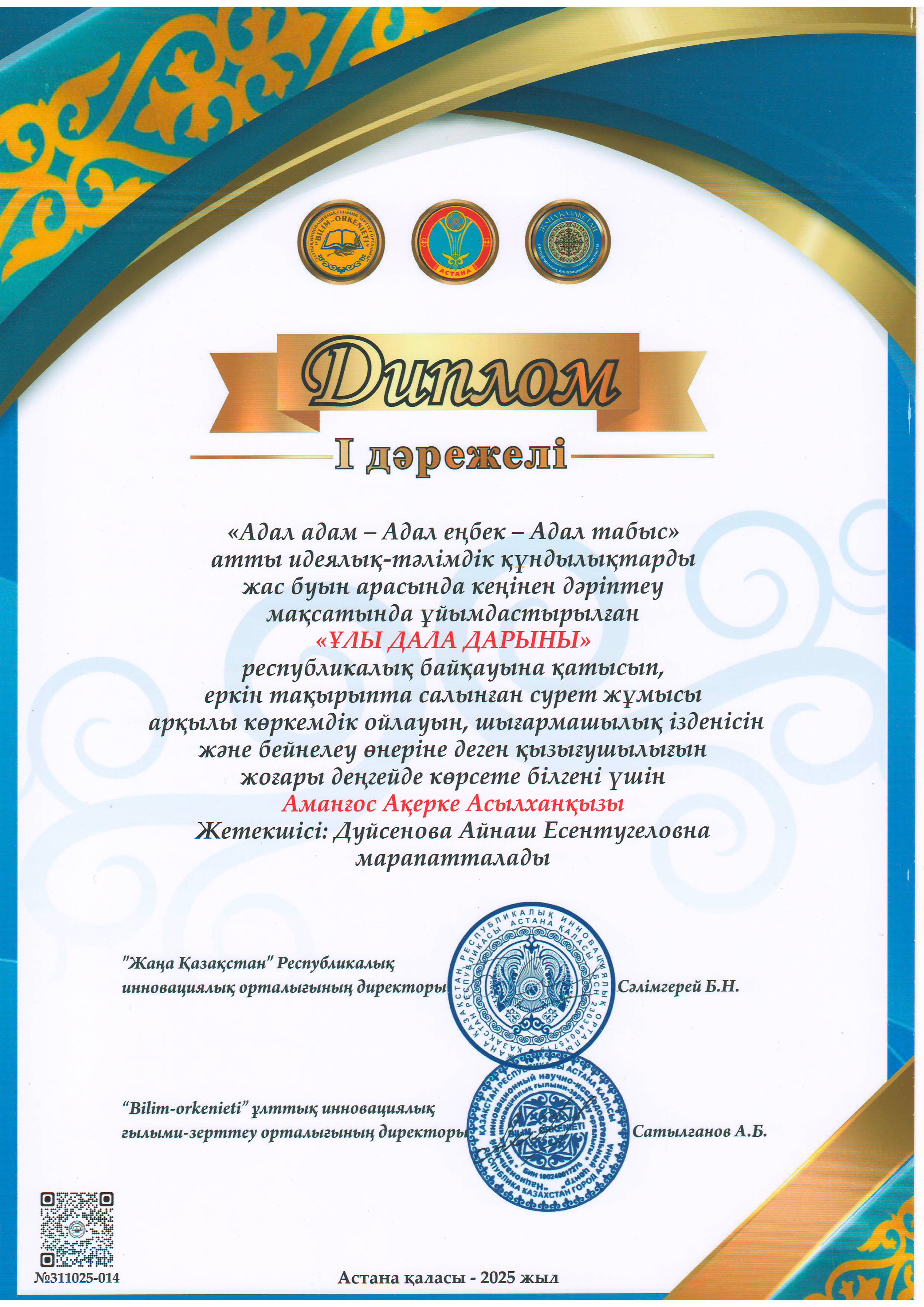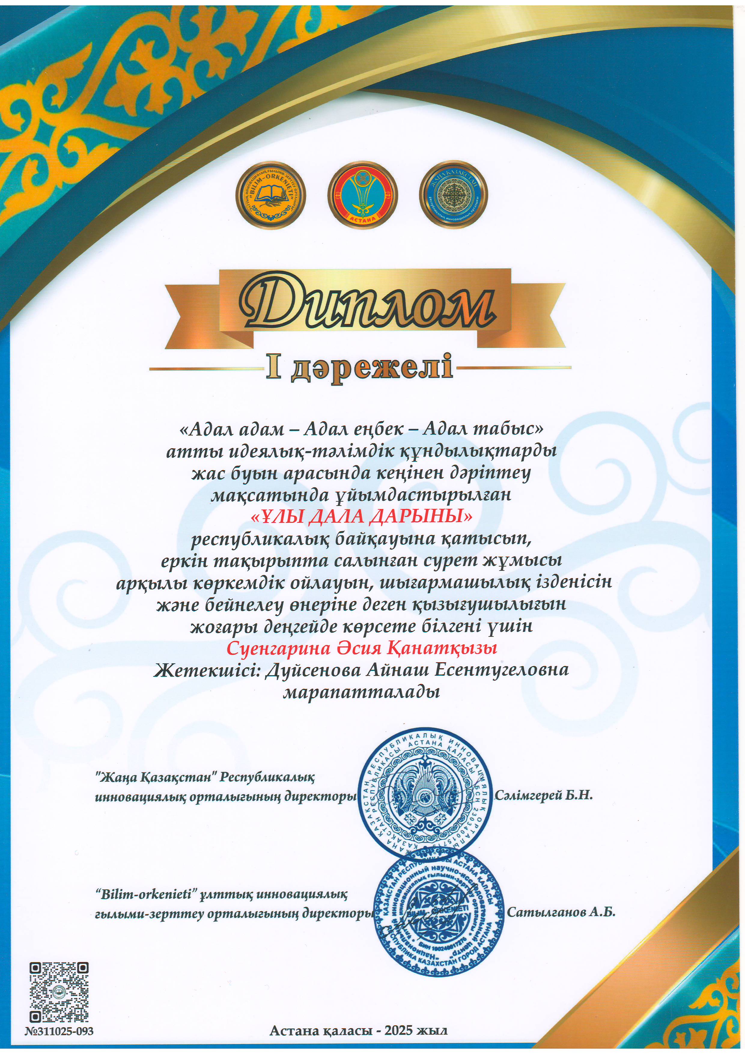 BILIN - ORKENIETI ұлттық инновациялық ғылыми - зерттеу орталығының ұйымдастыруымен өткізілген "Ұлы даланың дарыны" атты республикалық байқауына «Жас суретші» үйірмесінің оқушылары қатысып, Бауыржан Жәңгір І орын, Аманғос Ақерке І орын, Суйнгарина Әсия І орын иеленді.