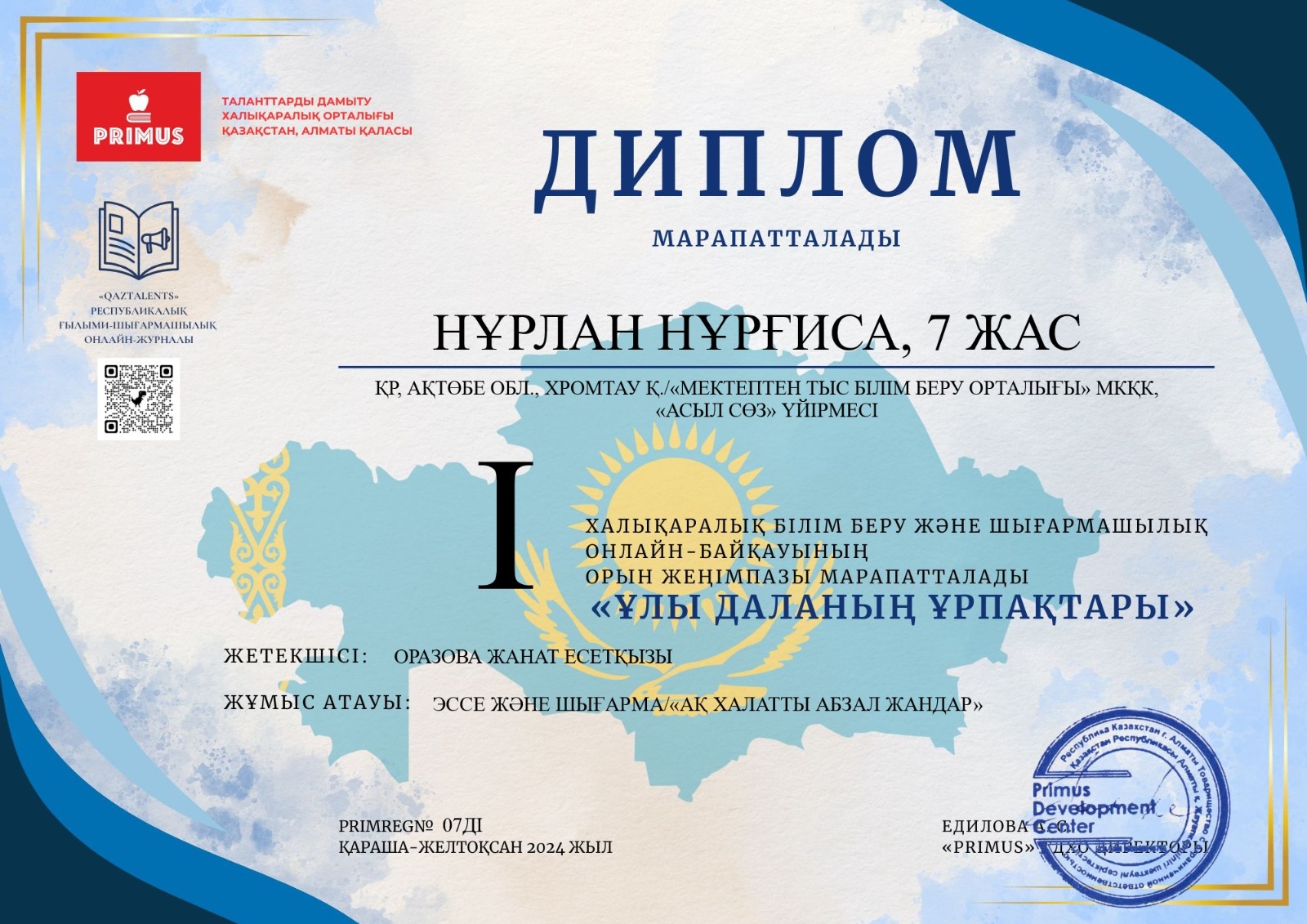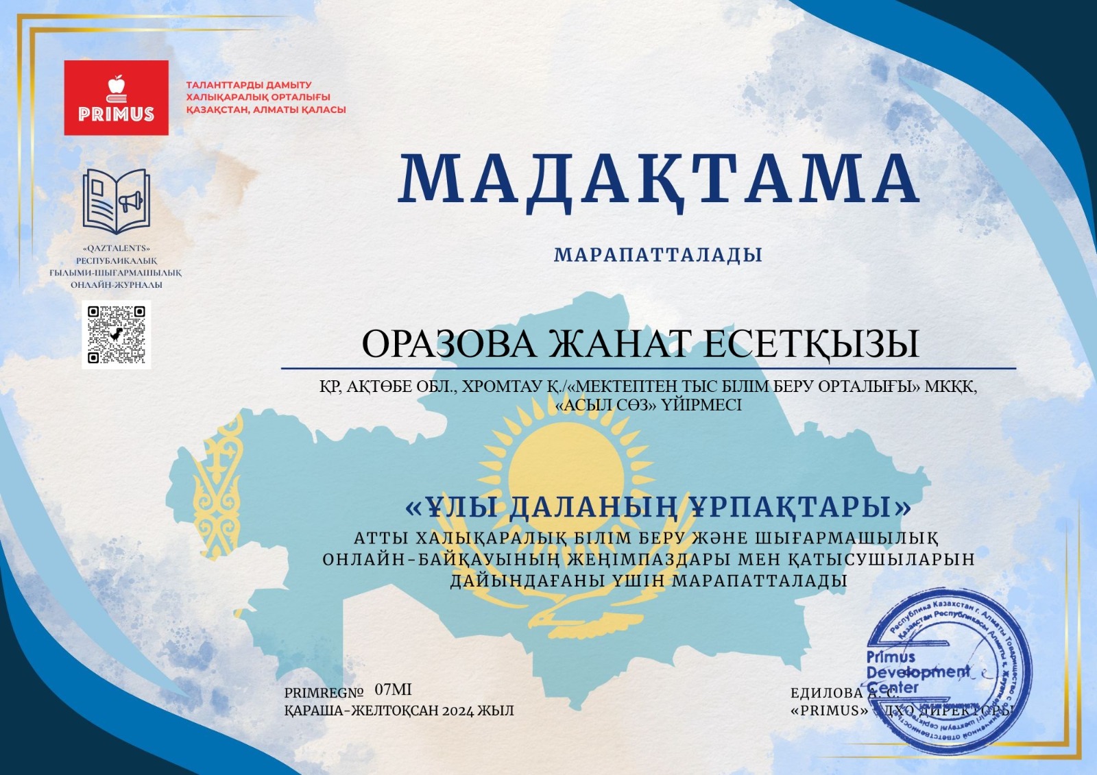 «Мектептен тыс білім беру орталығы» МКҚК-ның «Асыл сөз» үйірмесінің оқушылары «Ұлы даланың ұрпақтары» атты халықаралық білім беру және шығармашылық онлайн-байқауына белсене қатысып, жүлделі орындар иеленіп, дипломмен марапатталды.