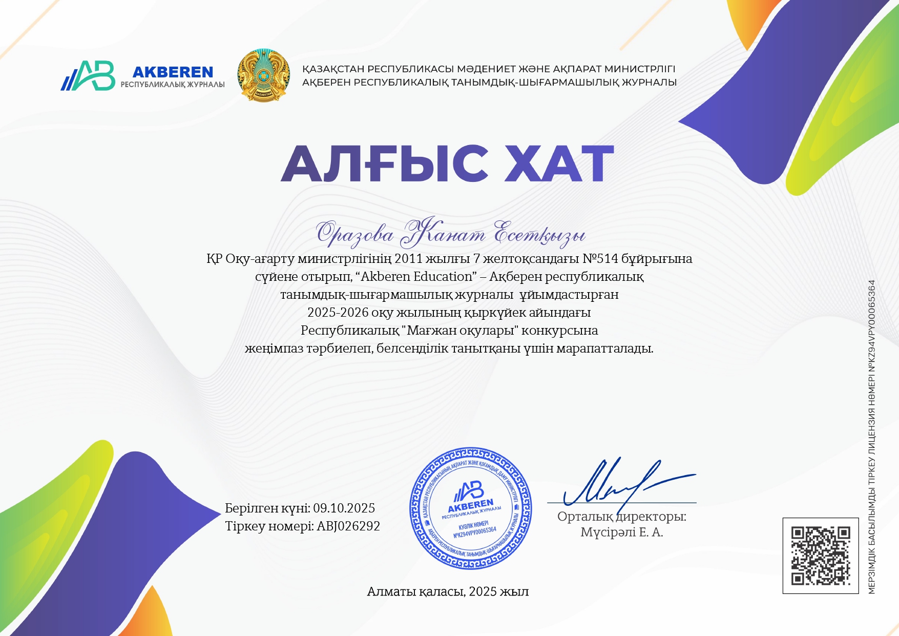 ҚР Оқу - ағарту министрлігінің 2011 жылғы 7 желтоқсандағы №514 бұйрығына сүйене отырып, "Akberen Education" - Ақберен республикалық. танымдық - шығармашылық журналы ұйымдастырған Республикалық "Мағжан оқулары" конкурсына қатысып, І орын иеленгені үшін Қайырбай Айару марапатталды. Жетекшісі Оразова Жанат Есетқызы, құтты болсын!