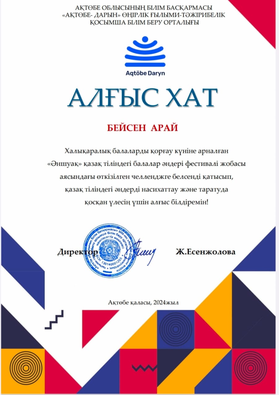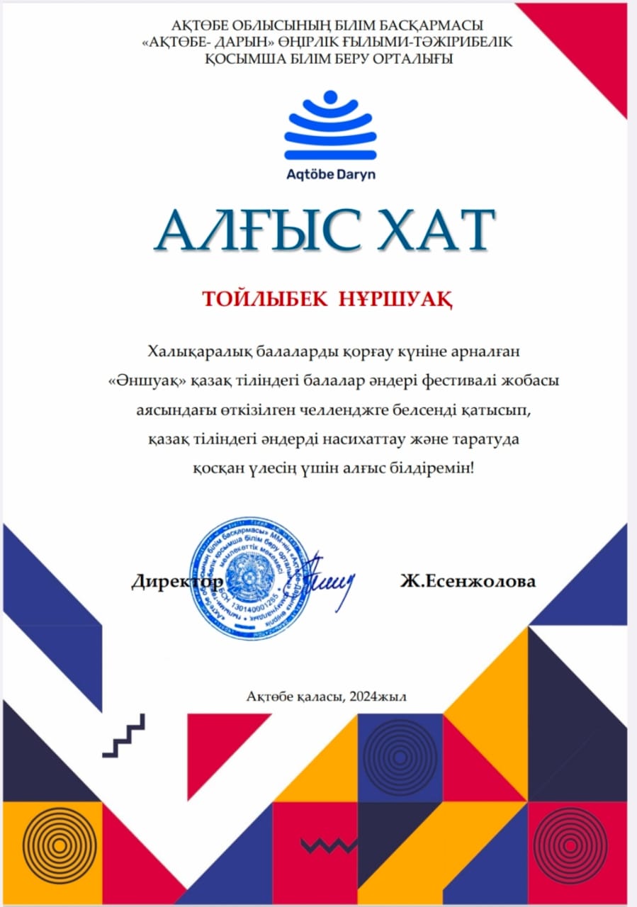 «Мектептен тыс білім беру орталығы» МКҚК-ның вокал үйірмелерінің оқушылары 2024 жылдың ақпан-мамыр аралығында өткен Халықаралық балаларды қорғау күніне арналған «Әншуақ» қазақ тіліндегі балалар әндері фестивалі жобасы аясында өткізілген челленджге белсенді қатысып, қазақ тіліндегі әндерді насихаттау және таратуда қосқан үлесі үшін алғыс хатпен марапатталды.