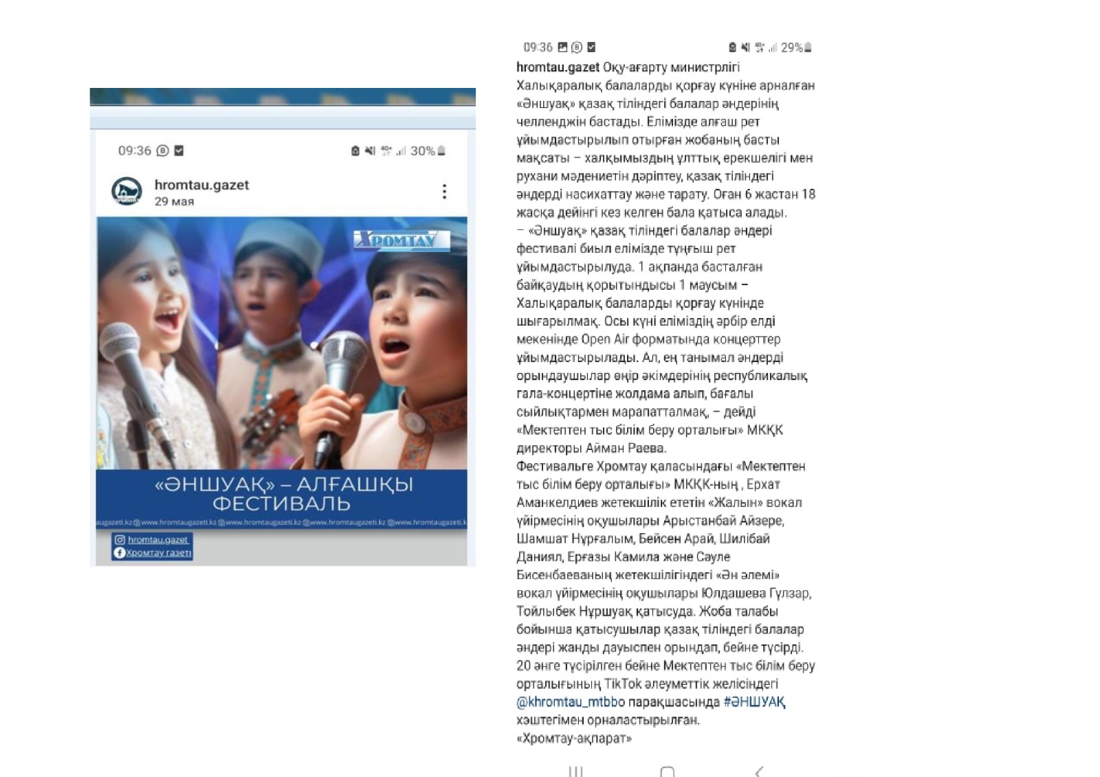 Фестивальге Хромтау қаласындағы «Мектептен тыс білім беру орталығы» МКҚК-ның, Ерхат Аманкелдиев жетекшілік ететін «Жалын» вокал үйірмесінің оқушылары Арыстанбай Айзере, Шамшат Нұрғалым, Бейсен Арай, Шилібай Даниял, Ерғазы Камила және Сәуле Бисенбаеваның жетекшілігіндегі «Ән әлемі» вокал үйірмесінің оқушылары Юлдашева Гүлзар, Тойлыбек Нұршуақ қатысуда. Жоба талабы бойынша қатысушылар қазақ тіліндегі балалар әндері жанды дауыспен орындап, бейне түсірді. 20 әнге түсірілген бейне Мектептен тыс білім беру орталығының TikTok әлеуметтік желісіндегі @khromtau_mtbbo парақшасында #ӘНШУАҚ хэштегімен орналастырылған.