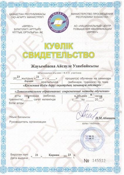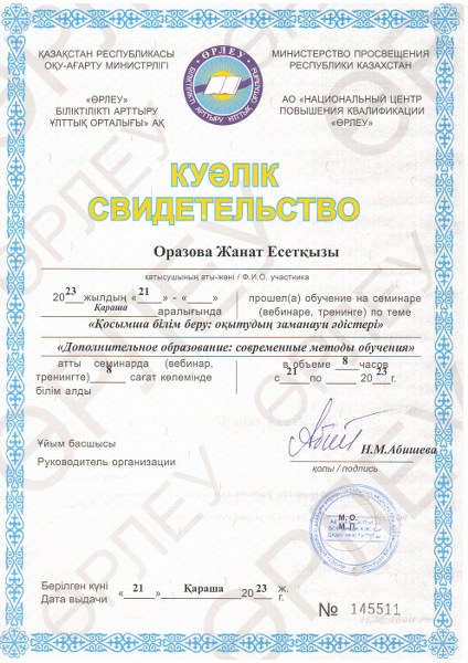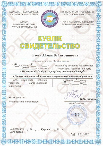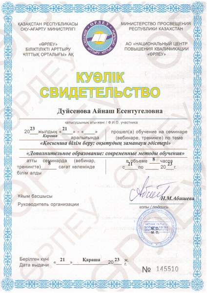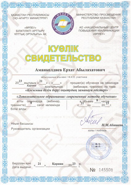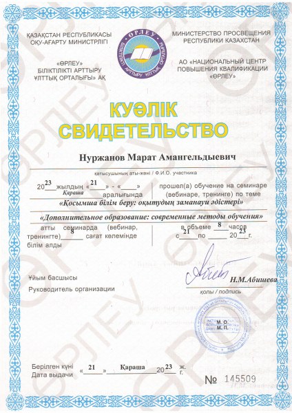 2023 жылдың 21 қарашасында орталықтың қосымша білім беру педагогтары «Өрлеу» біліктілікті арттыру ұлттық орталығы» АҚ өткізген «Қосымша білім беру: оқытудың заманауи әдістері» тақырыбындағы семинарға қатыстып, әдістемелік көмек алып куәлік иеленді.