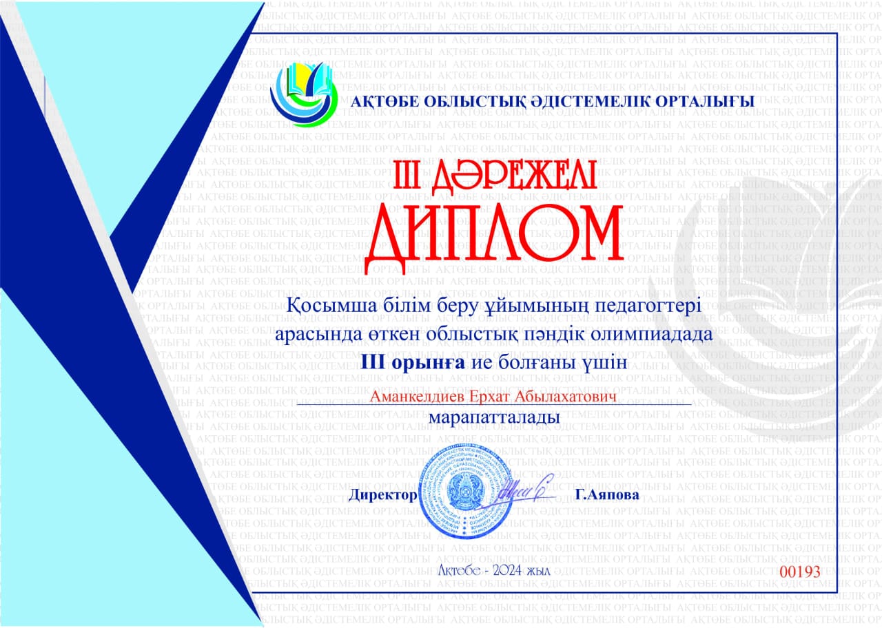 Ақтөбе облыстық әдістемелік орталығының ұйымдастыруымен қосымша білім беру ұйымының педагогтері арасында өткізілген облыстық пәндік олимпиадаға "Мектептен тыс білім беру орталығы" МКҚК-ның педагогтері Аманкелдиев Е.А., Дуйсенова А.Е., Зайнолла Р.Ә. қатысып, жүлделі 3-орын иеленіп, Дипломмен марапатталды.