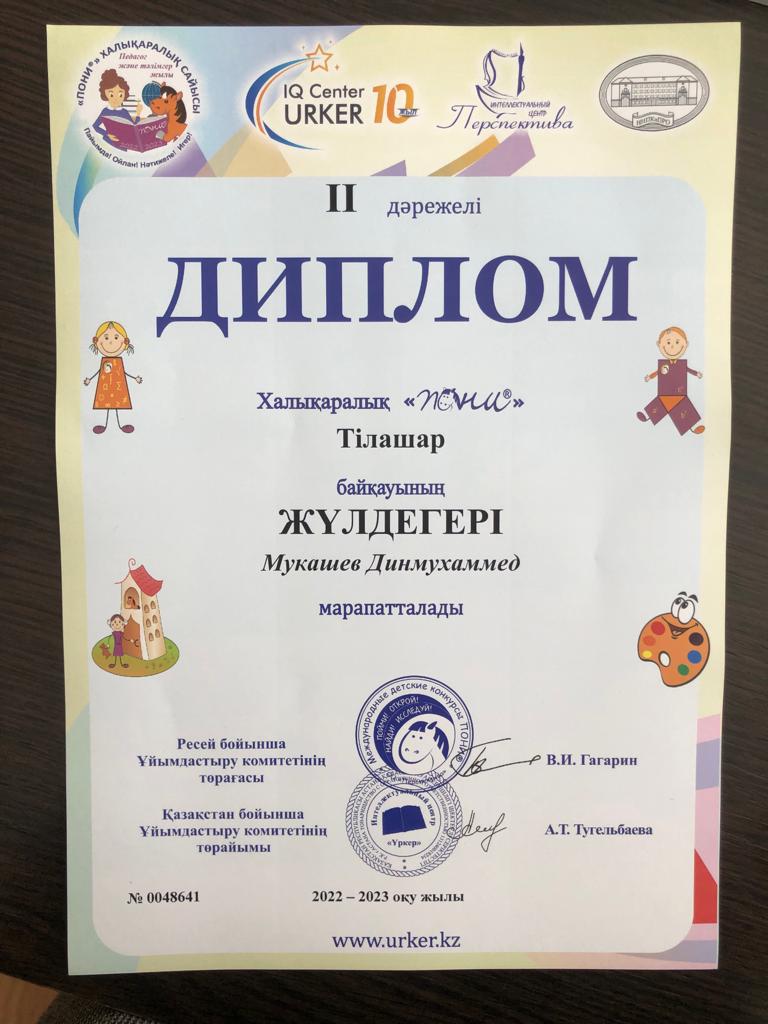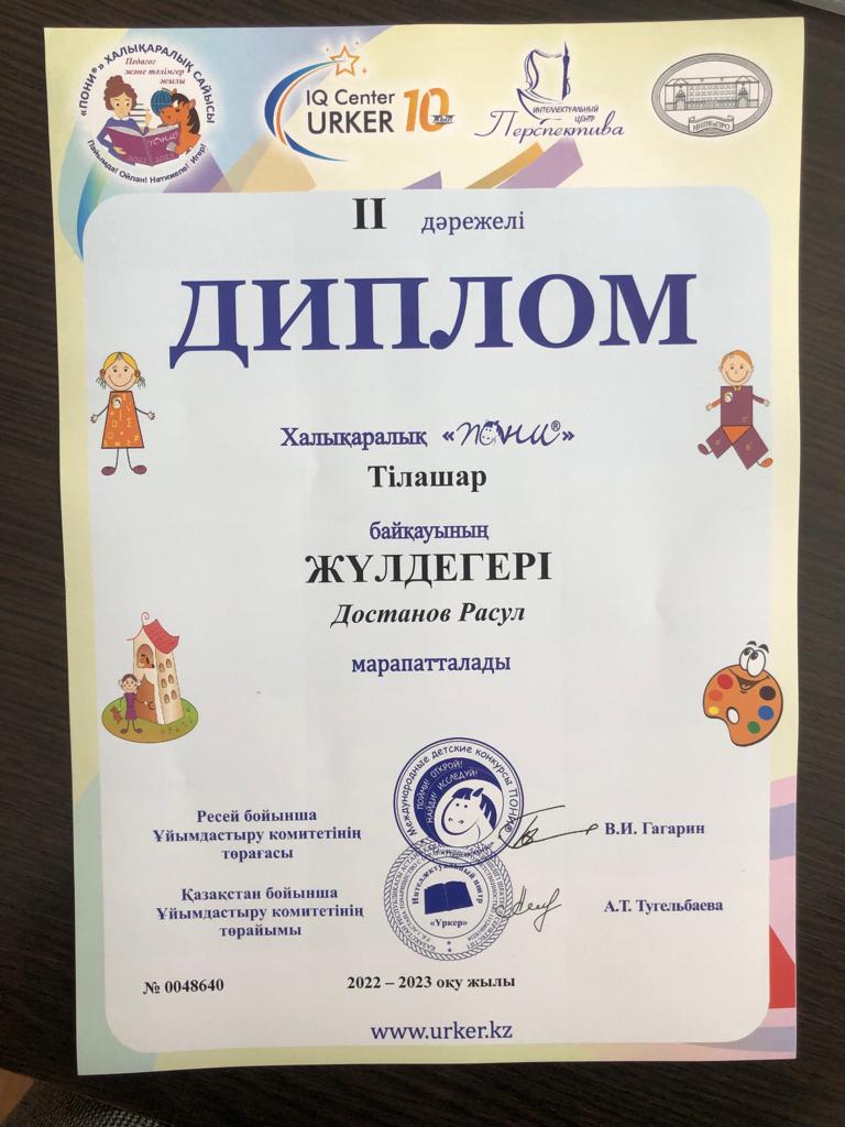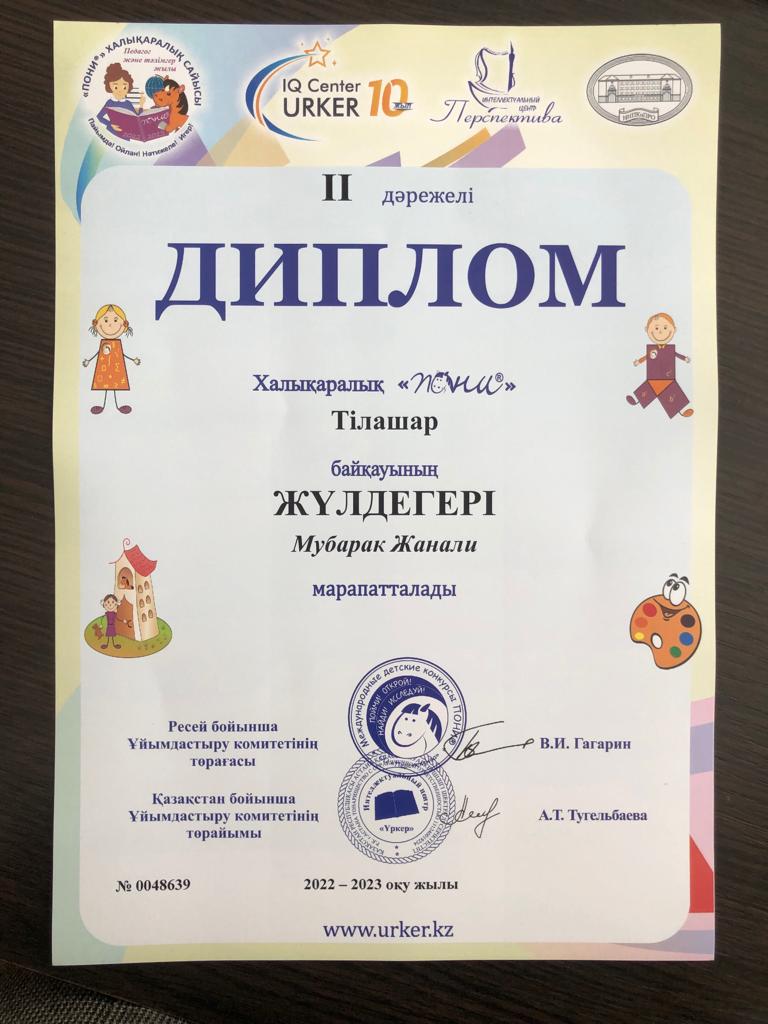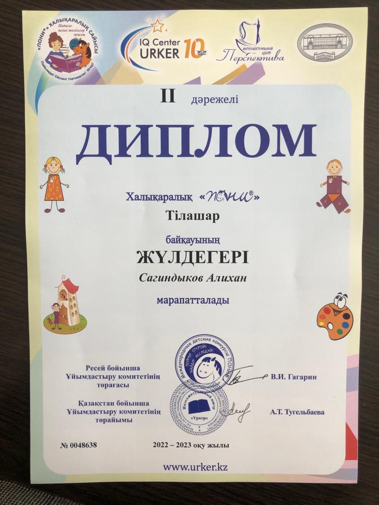 "Мектептен тыс білім беру орталығы" МКҚК "Зерек бала" үйірмесінің оқушылары Халықаралық "Пони" Тілашар байқауына қатысып, Сагиндыков Алихан, Мубарак Жанали, Мукашев Динмухаммед, Достанов Расул 2 дәрежелі дипломмен марапатталды. Жетекшісі: Ермагамбетова Махаббат Калуовна.