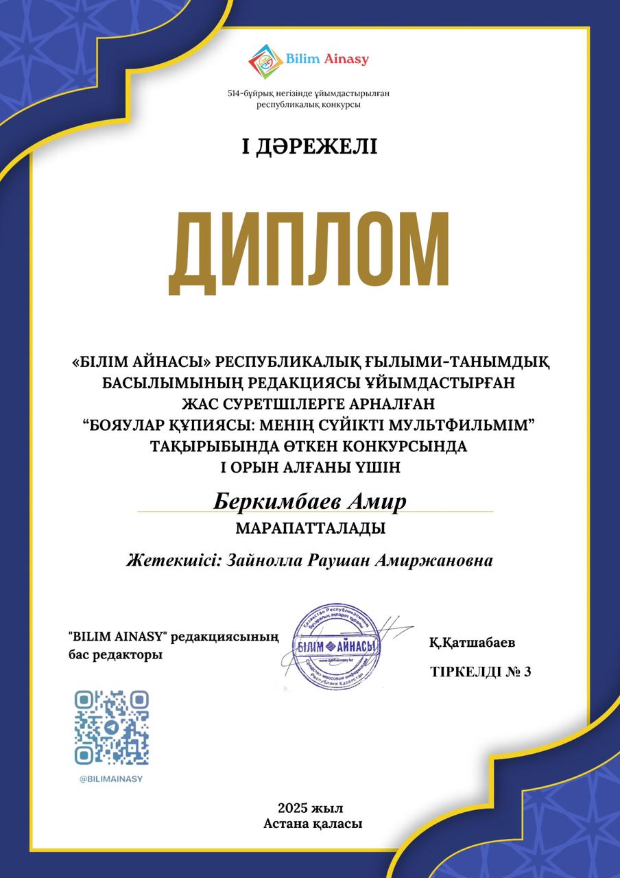 Жас суретшілерге арналған «Бояулар құпиясы: менің сүйікті мультфильмім, менің отбасым» тақырыптарындағы байқауына қатысқан «Волшебная кисточка» үйірмесінің оқушысы Беркімбаев Амир жүлделі І орынға ие болды.