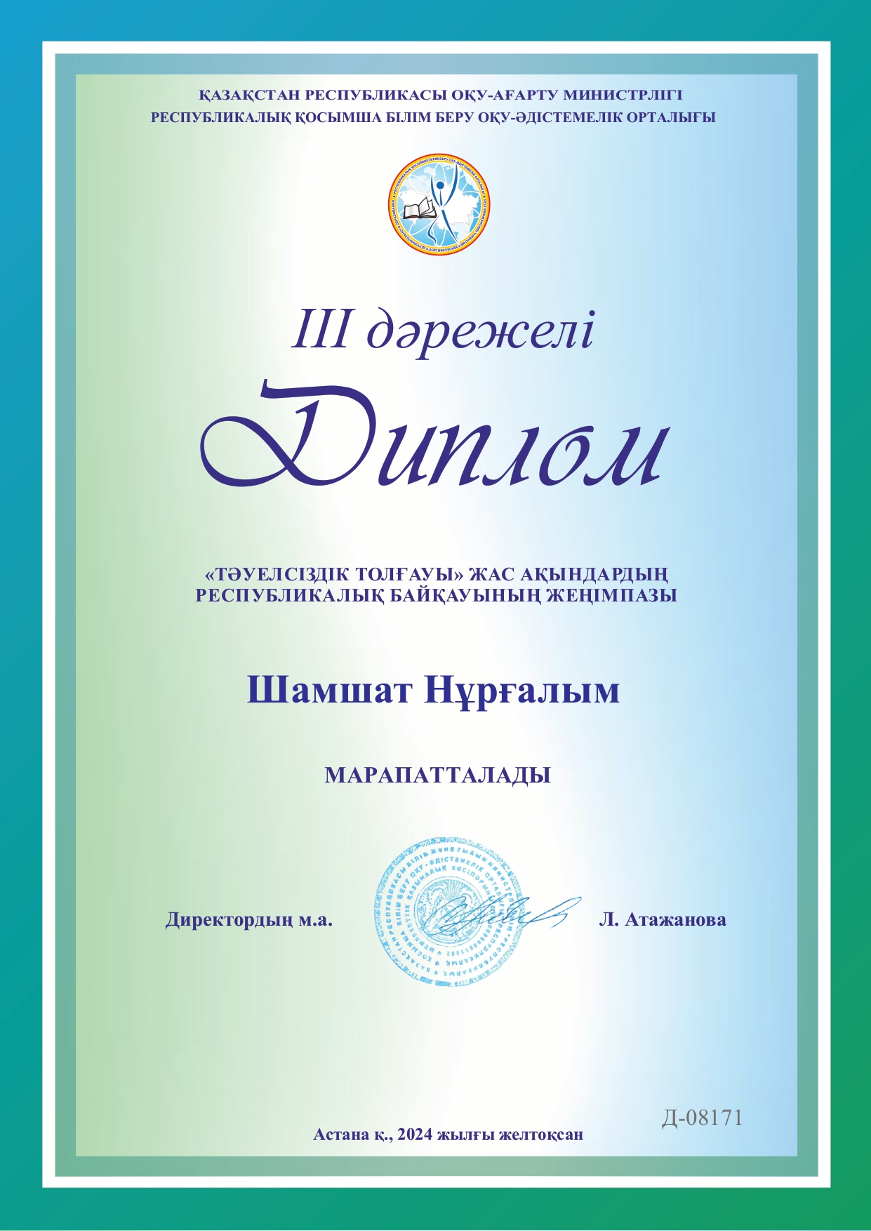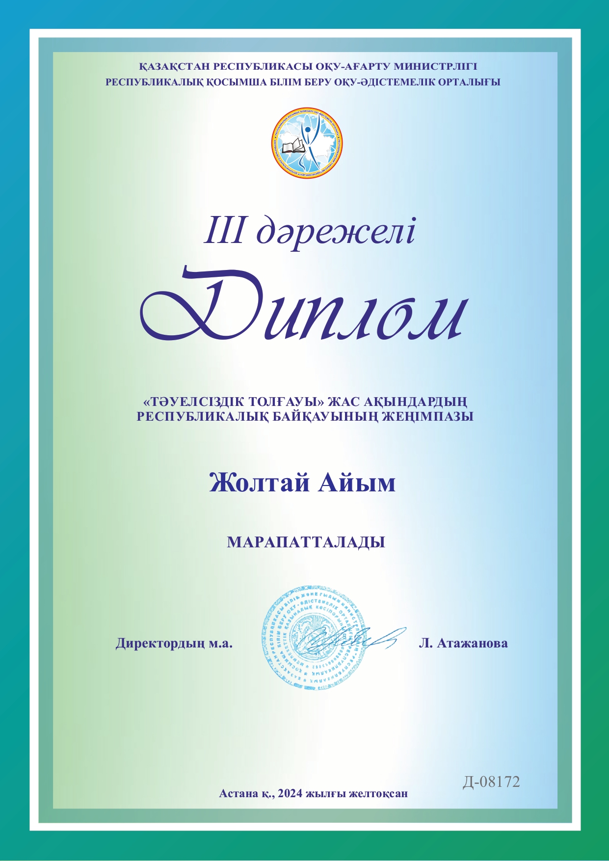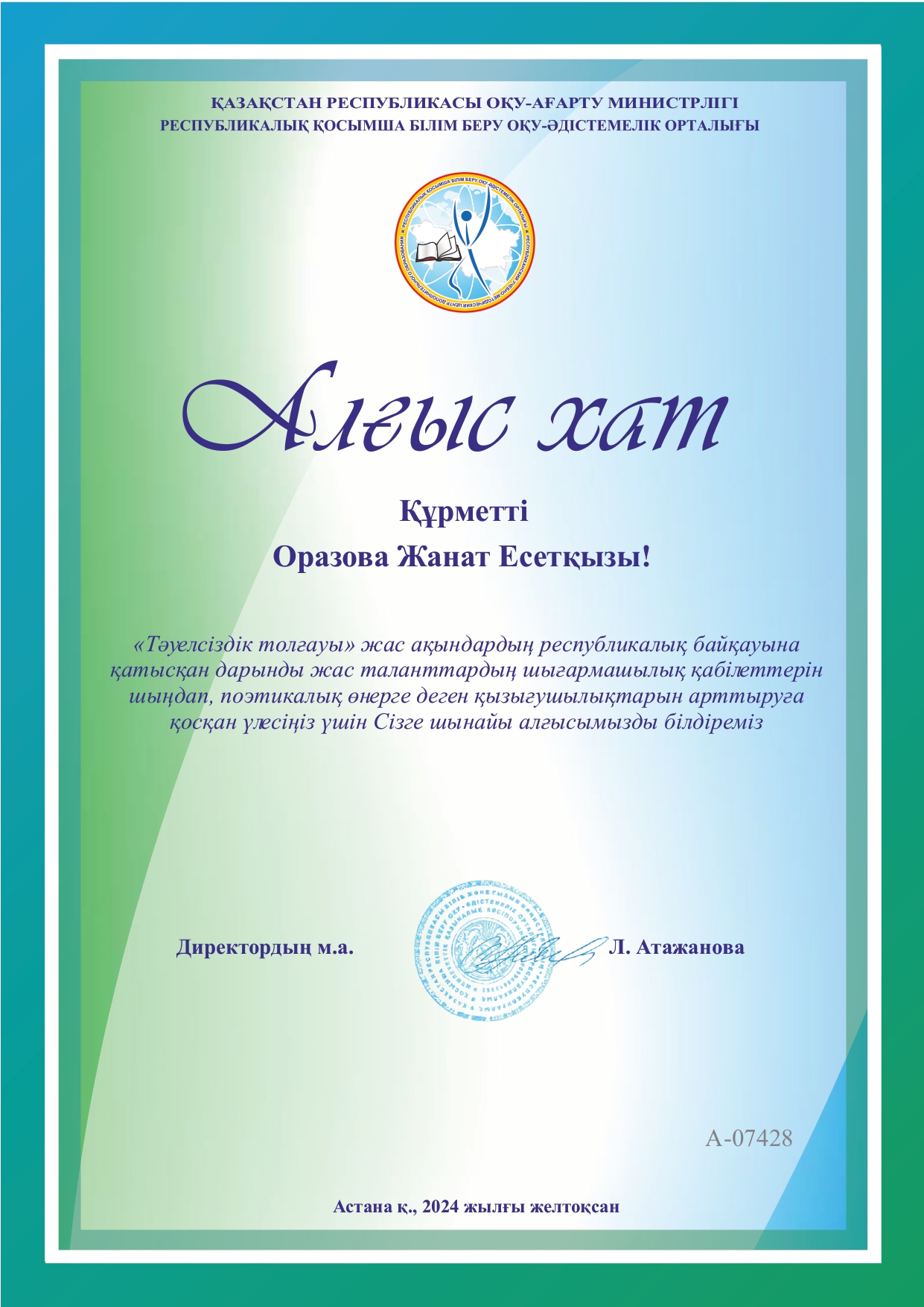 «Мектептен тыс білім беру орталығы» МКҚК-ның «Театр өнері» және «Асыл сөз» үйірмесінің оқушылары «Тәуелсіздік толғауы» жас ақындардың республикалық байқауына белсене қатысып, жүлделі орындар иеленді.